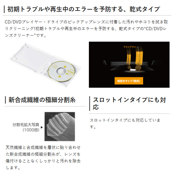 初期トラブルや再生中のエラーを予防する、乾式タイプの“CD/DVDレンズクリーナー”です。