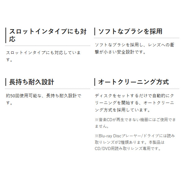 ※Blu-ray Discプレーヤー/ドライブには読み取りレンズが2種類あります。本製品はCD/DVD用読み取りレンズ専用です。