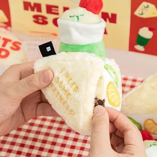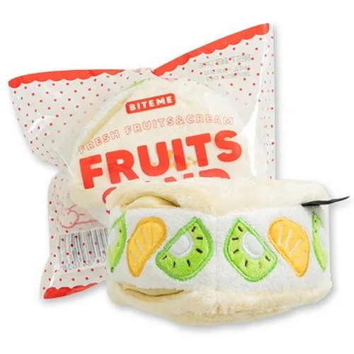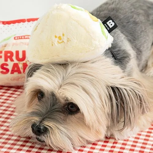 クリームたっぷりのフルーツサンドを、わんちゃんのぬいぐるみトイにしちゃいました