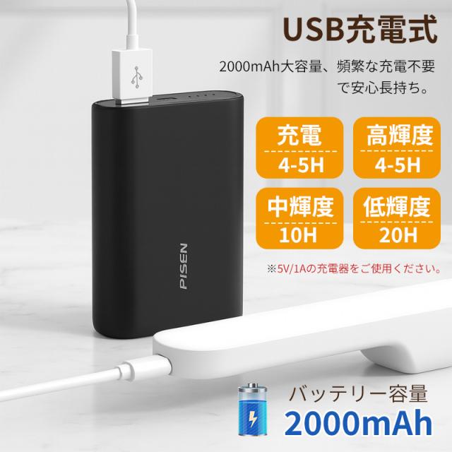 約4〜5時間の充電で、最大光量なら約4〜5時間、中光量で10時間、低光量なら最長20時間の連続使用が可能。頻繁な充電が不要で、安心して長時間使えます。