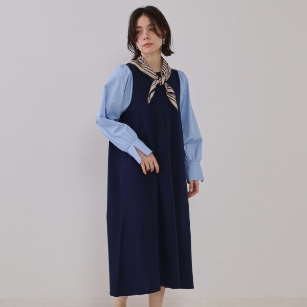 ・ボディはニット素材で裾にかけて自然なフレア感を出し、袖部分はシャツ素材で切替えたドッキングワンピース。