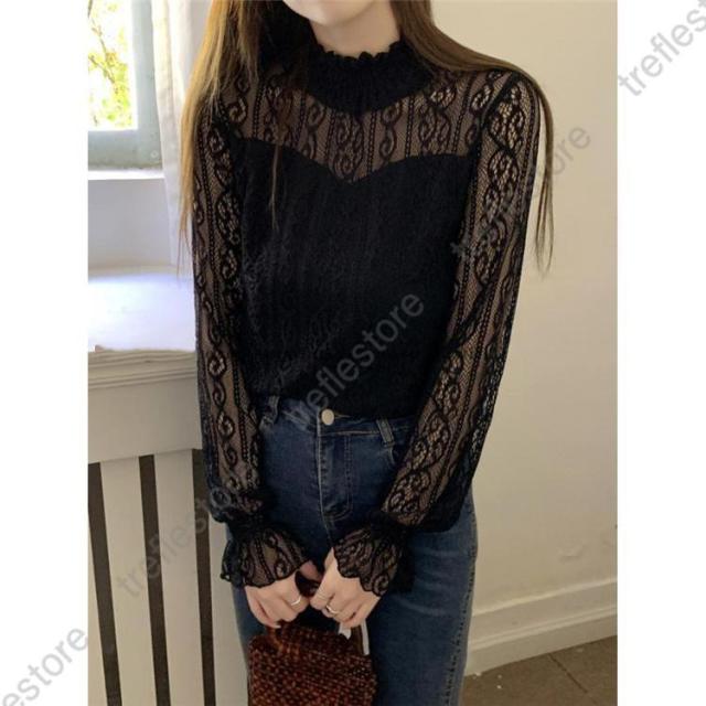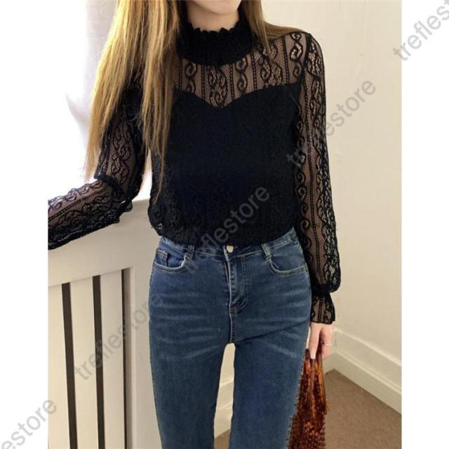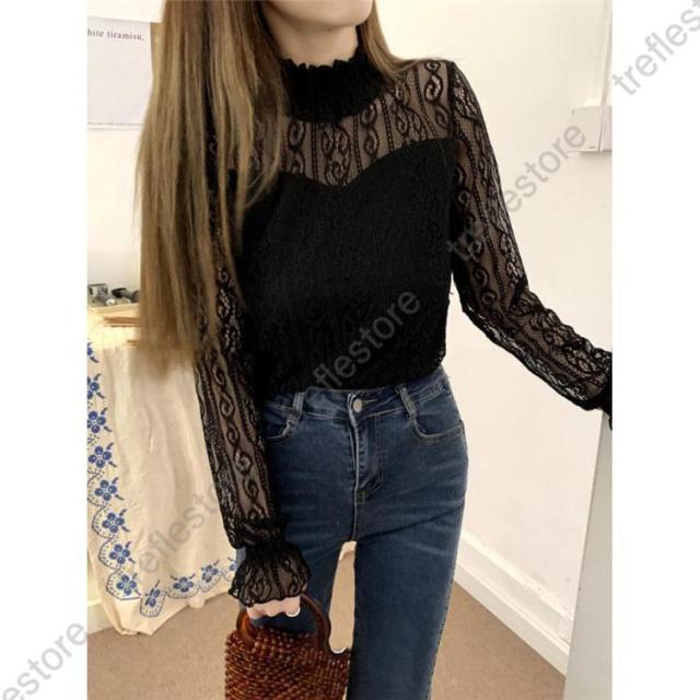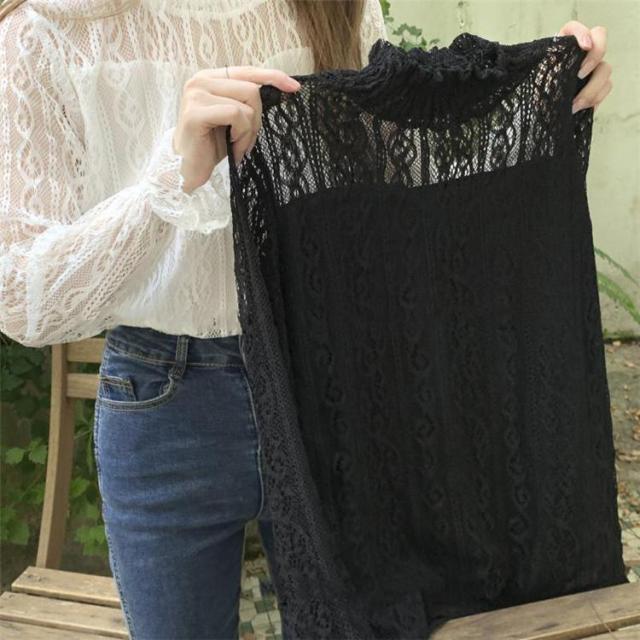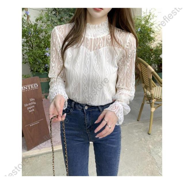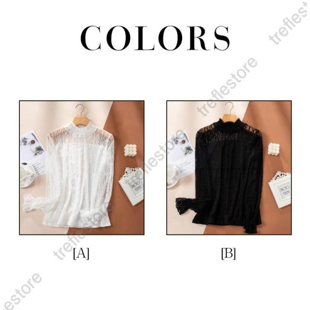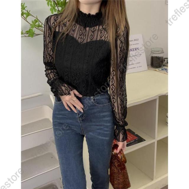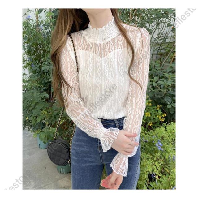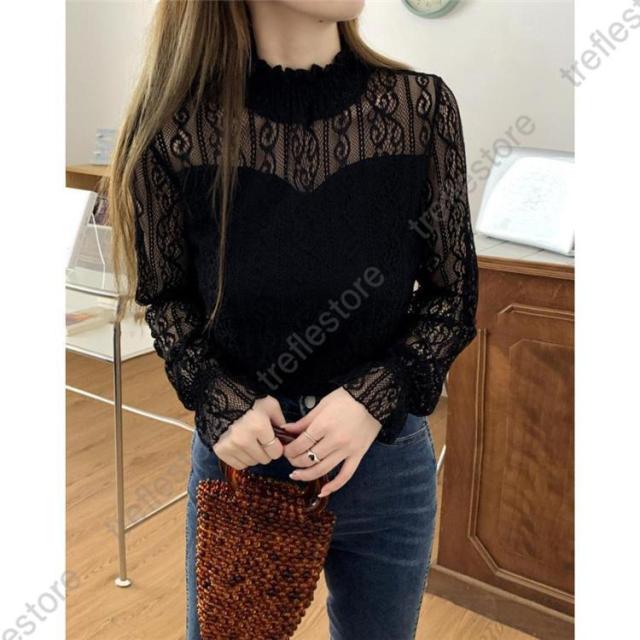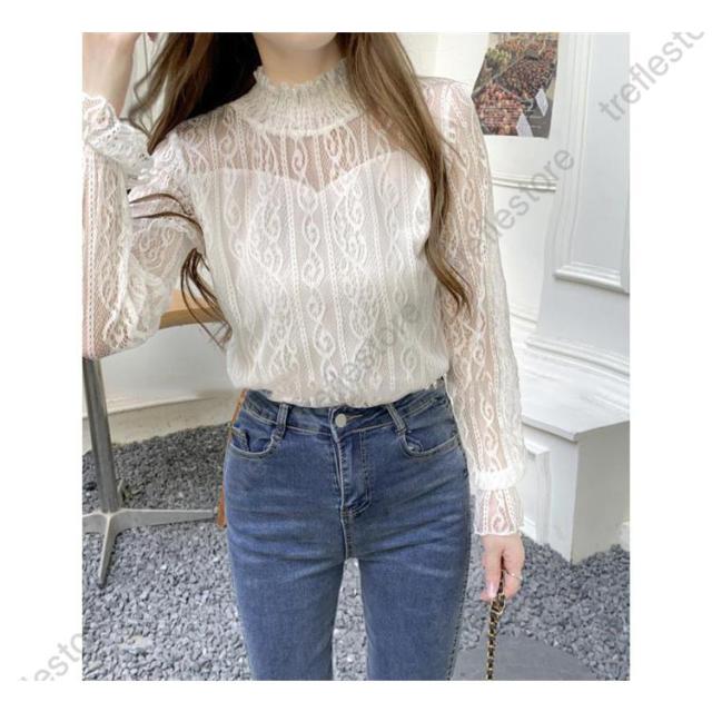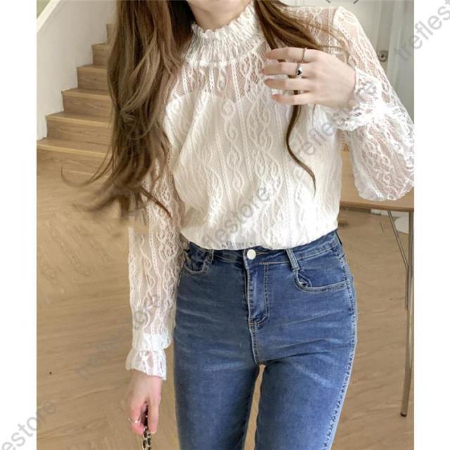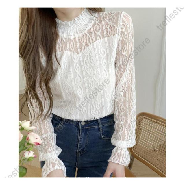 【ポイント5倍!】レース ブラウス レディース フリル シースルー トップス 花柄 プチハイネック きれいめ おしゃれ 長袖 トップス 透け感 ブラウス 重ね着 おしゃれ かわいい