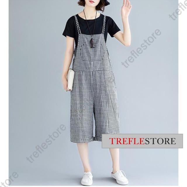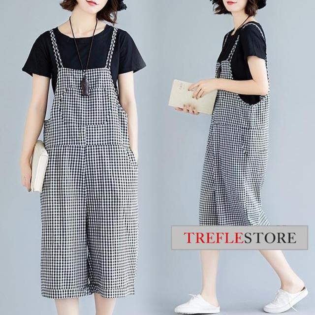 【ポイント5倍!】サロペットパンツ 夏 レディース サロペット ゆったり チェック柄 オーバーオール 薄手 サマーパンツ クロップドパンツ 七分丈 オールインワン