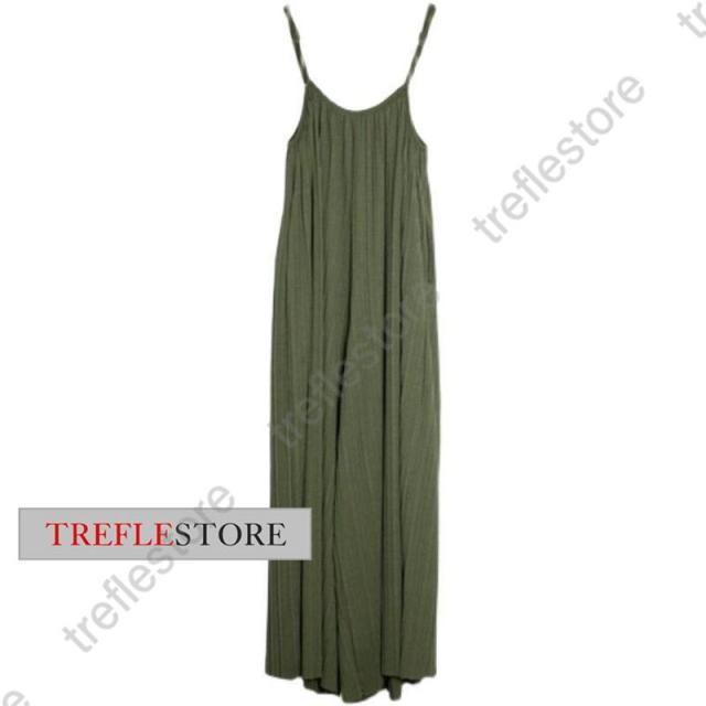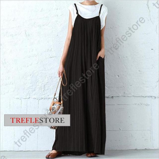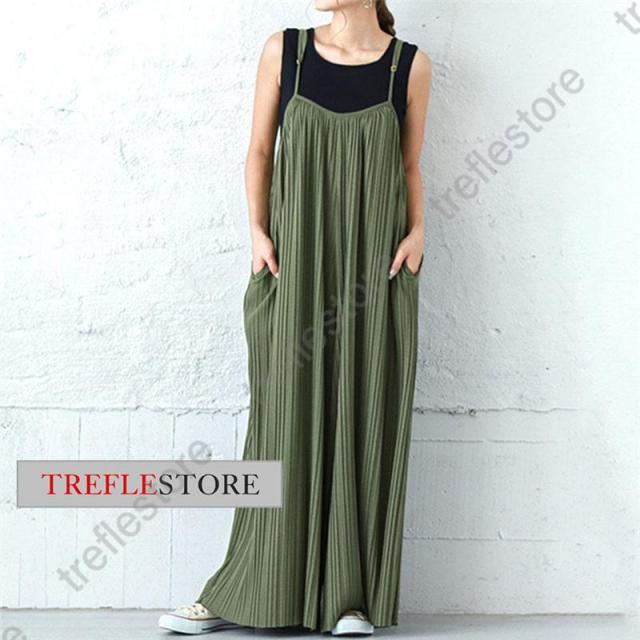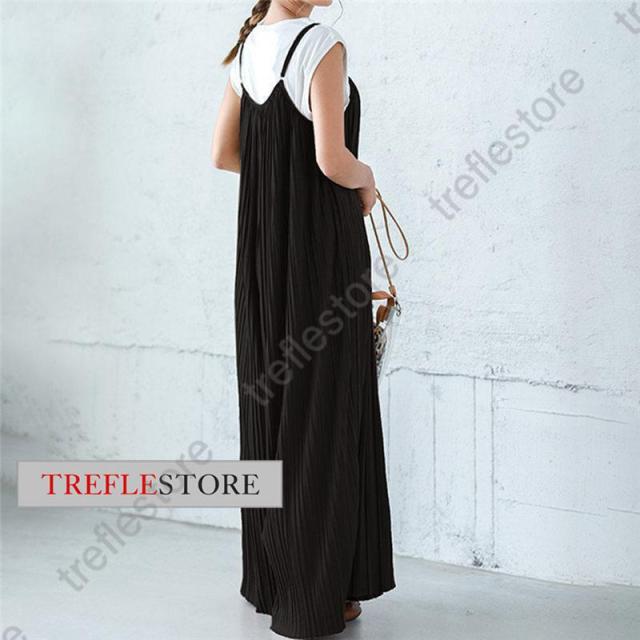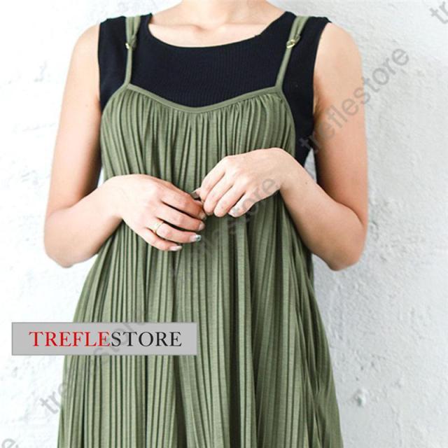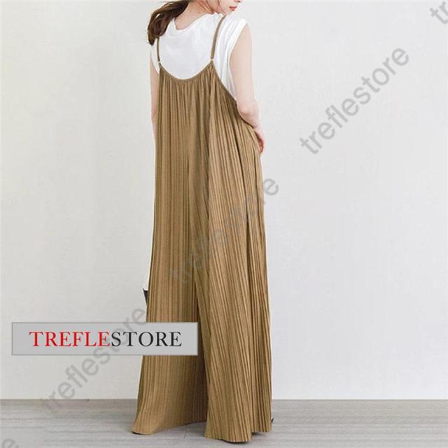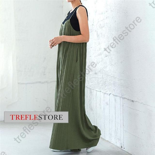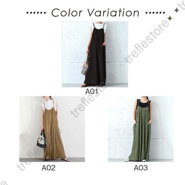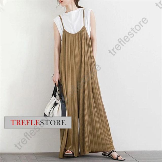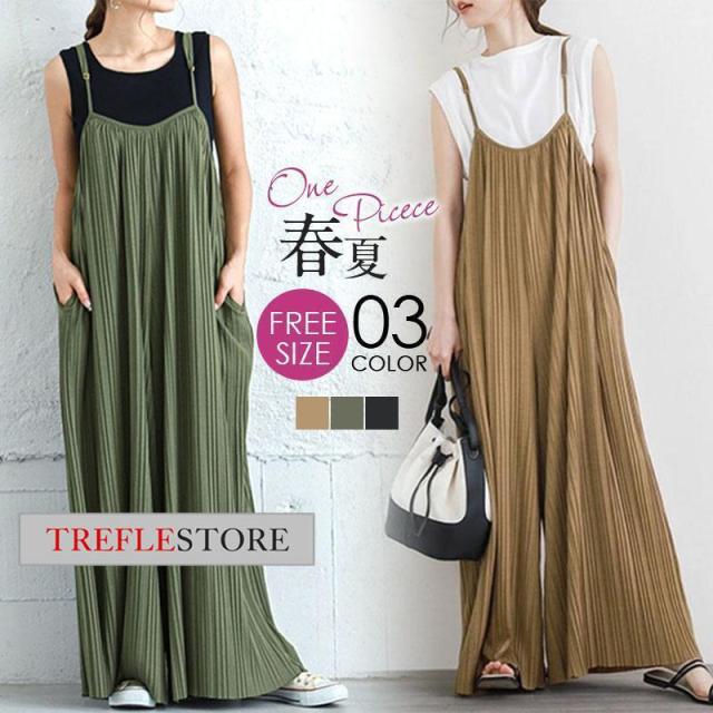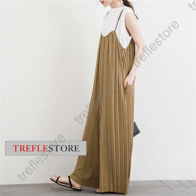 【ポイント5倍!】プリーツキャミサロペット マキシワンピース レディース サロペット 重ね着 ワイドパンツ ガウチョ 無地 体型カバー 着痩せ スカンツ