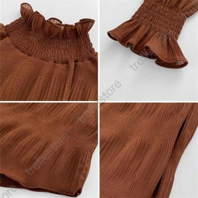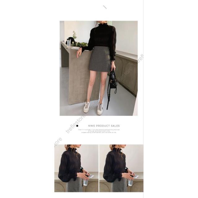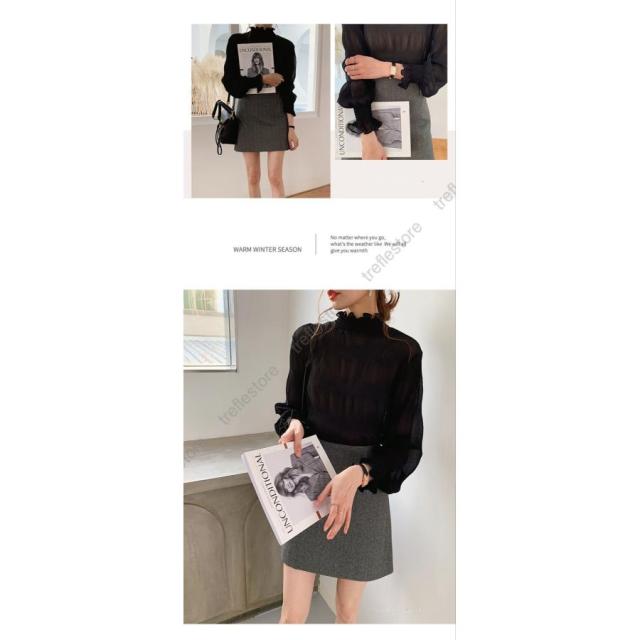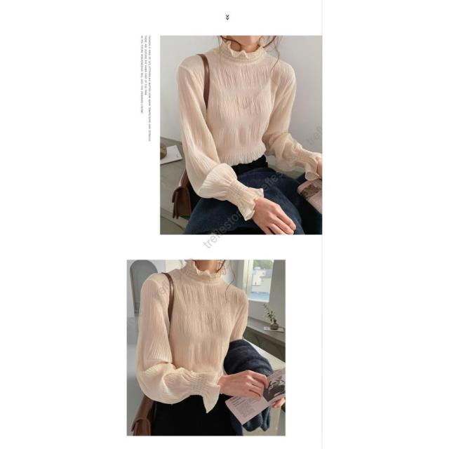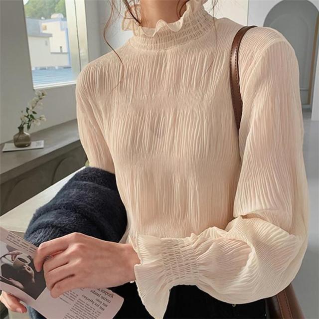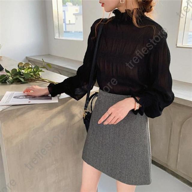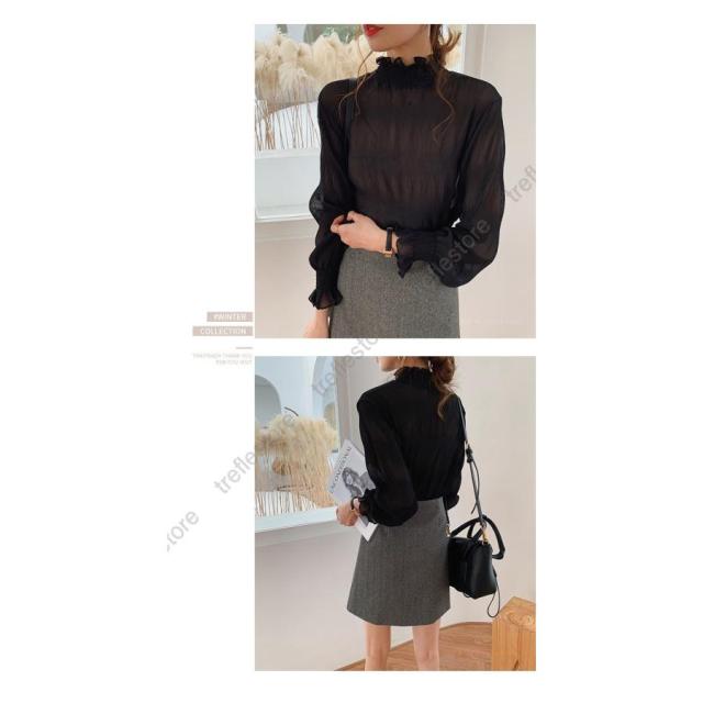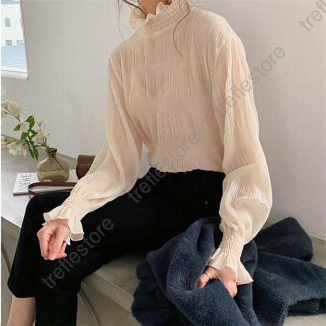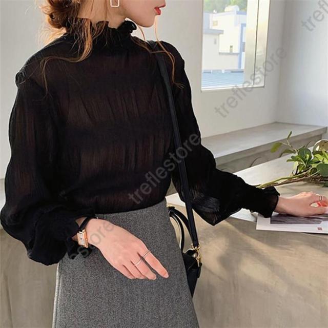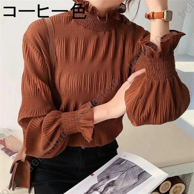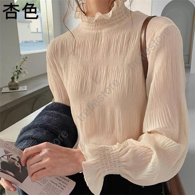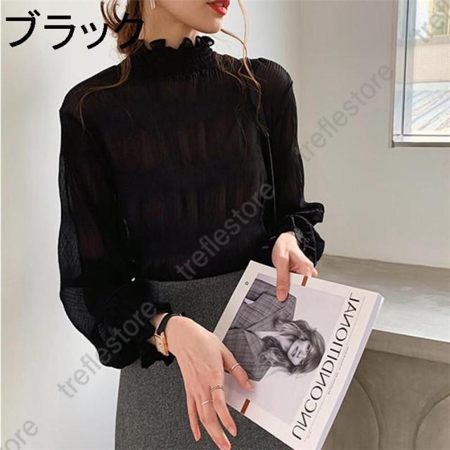 【ポイント5倍!】ブラウス シャツブラウス ギャザー レディース プチハイネック フリル シフォントップス 着やせ おしゃれ プルオーバー インナー 透け感 無地 長袖 フレア袖