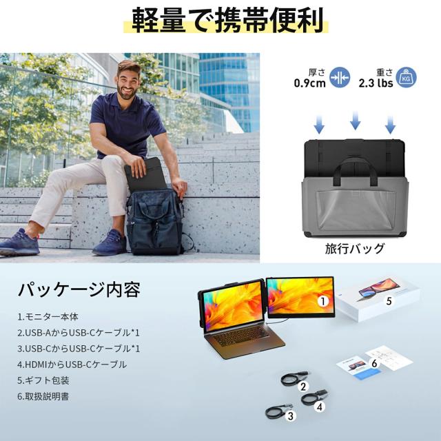 ノートブックPCのトラベルディスプレイにType-C、HDMI、USB-Aを直接接続するだけで、追加のドライバをダウンロードする必要はありません。60Hzの高速応答、FPSゲームやアクション映画など動きの速いコンテンツを楽しめます。ノートパソコンのポータブルデュアルディスプレイには、必要な各ケーブル(1*USB-A to USB-C 、1*USB-C to USB-Cケーブル、1*HDMI to TYPE-Cケーブル)が付属しています。ご注意:HDMIケーブルを使用する場合は、同じスクリーンエクステンダーに追加のUSB-A - USB-Cケーブルを接続して給電してください。