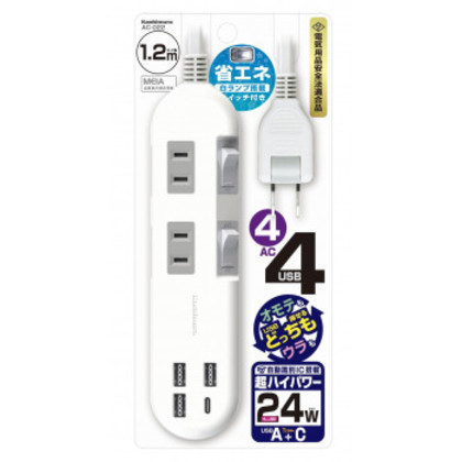 電源タップ 4AC 4USB 3A+1C 24W 1.2m リバーシブル SW WH AC-022 |b03