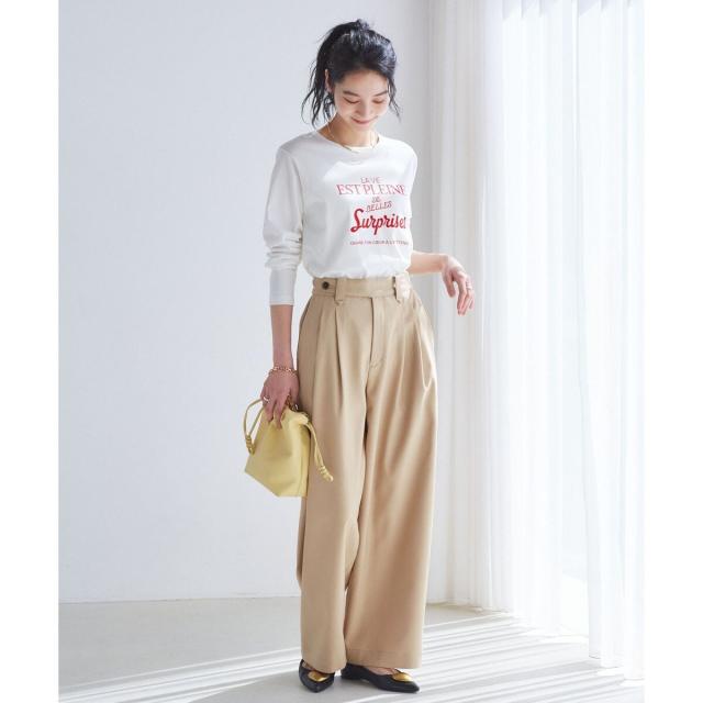 ロゴプリントチビT(BVM15100)などがコンパクトトップスで合わせることでボトムのワイド感とのスタイリングバランスが良いです。