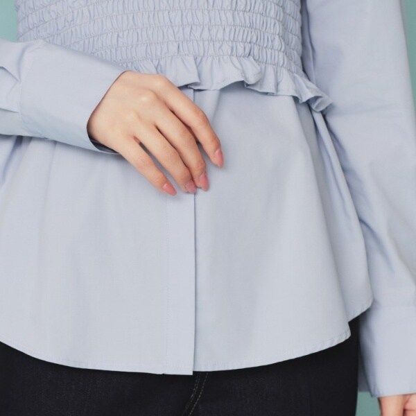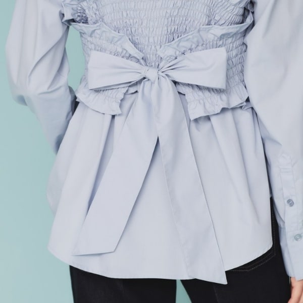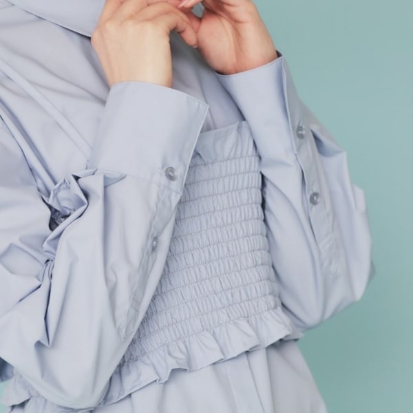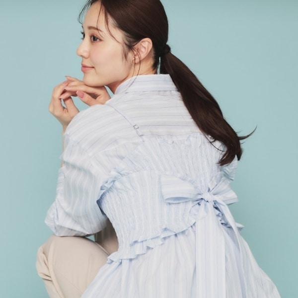 ■素材:ホワイト(001) サックスブルー(090) シャツ:ポリエステル63% コットン37% ビスチェ:ポリエステル63% コットン37%、サックスブルー(390) シャツ:コットン45% レーヨン22% ポリエステル20% ナイロン13% ビスチェ:コットン45% レーヨン22% ポリエステル20% ナイロン13%