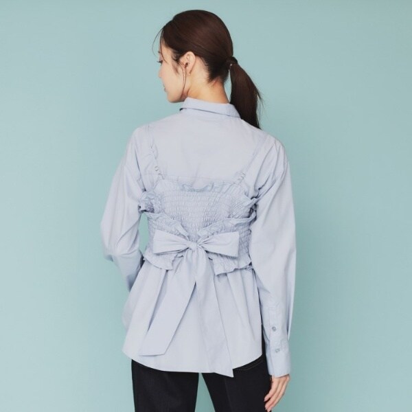 ・シャーリングのベアキャミソールとベーシックシャツがセットになった、トレンド感満載のアイテムです。