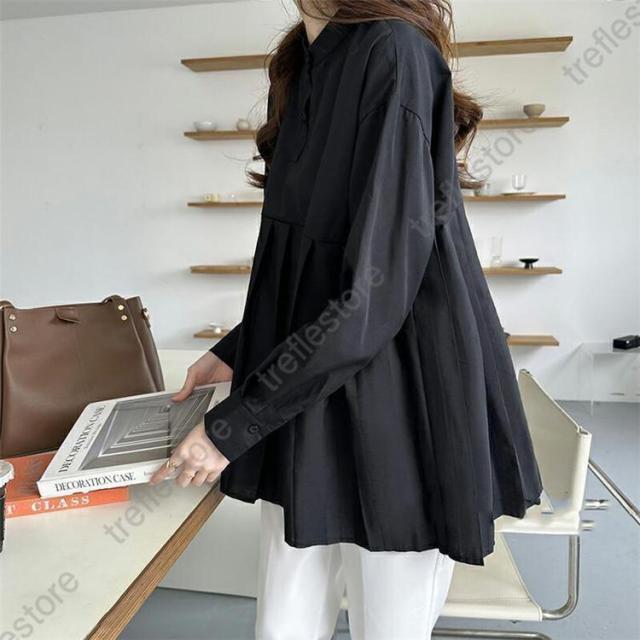 【ポイント5倍!】ブラウス レディース チュニック トップス 長袖 ゆったり 体型カバー aライン 切り替え 長め ハイウエスト プリーツ シンプル シャツ シャツブラウス オフィス