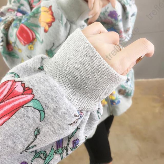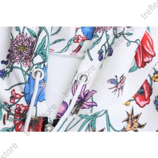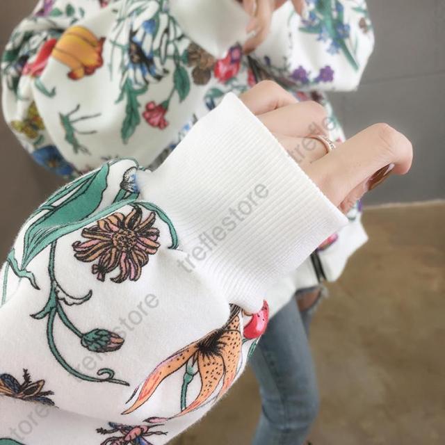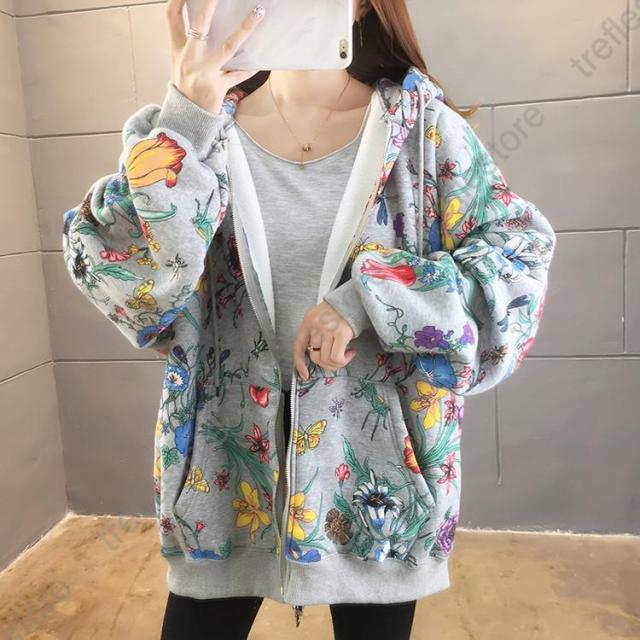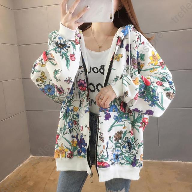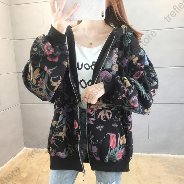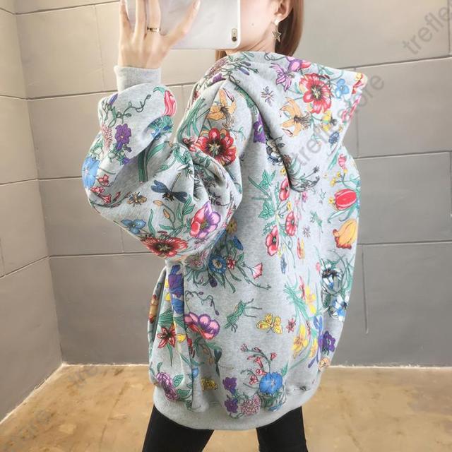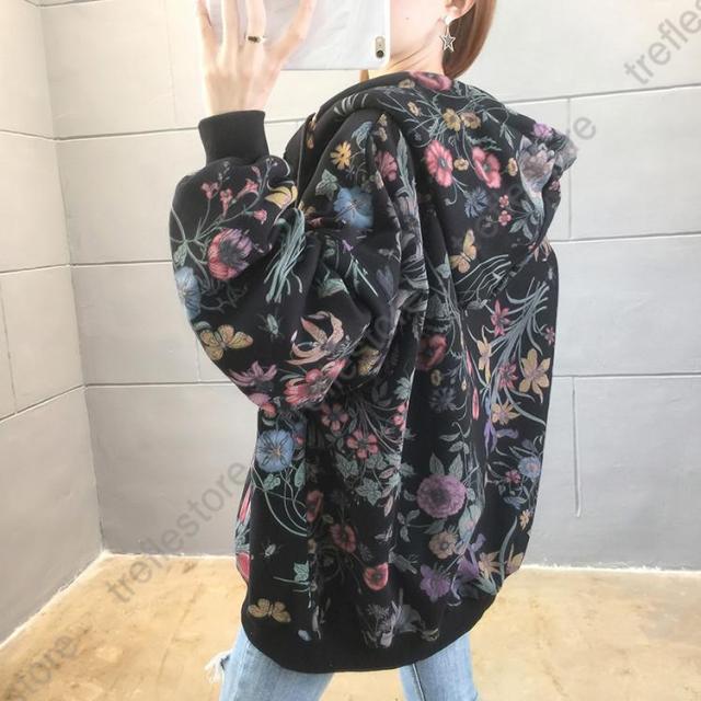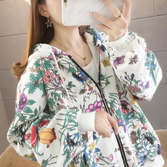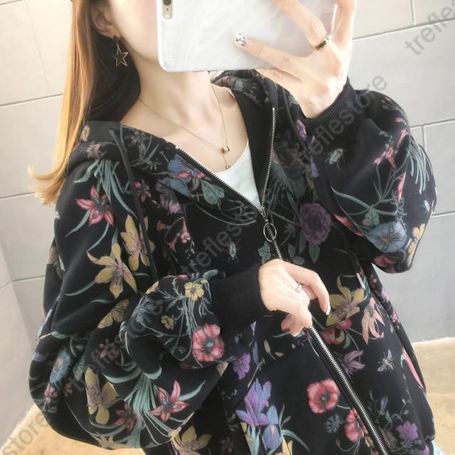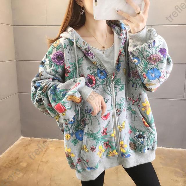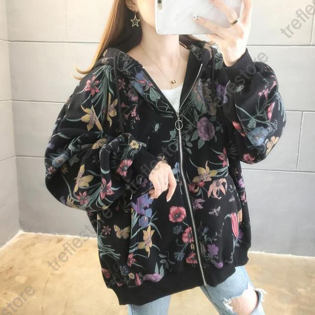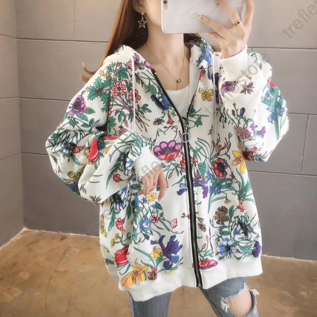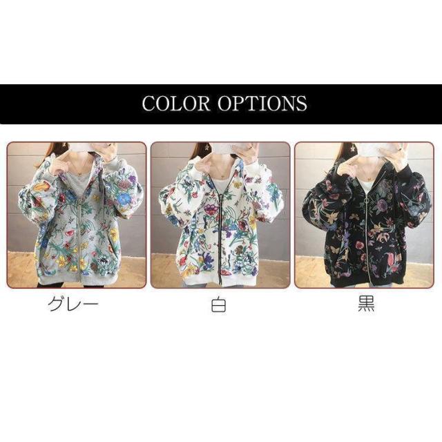【ポイント5倍!】パーカー レディース ゆったり ジップアップ 花柄 長袖 フーディ トップス フラワープリントパーカー