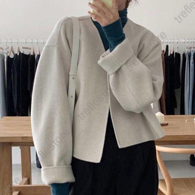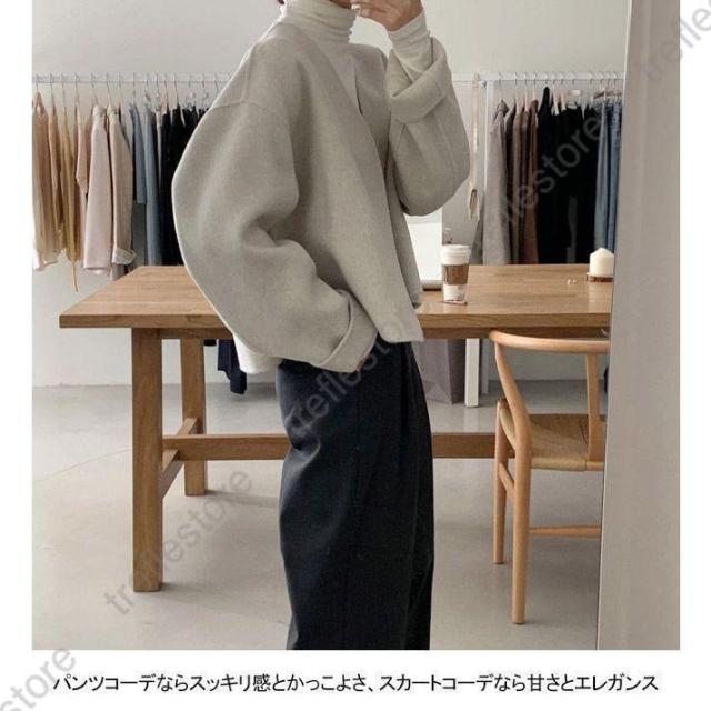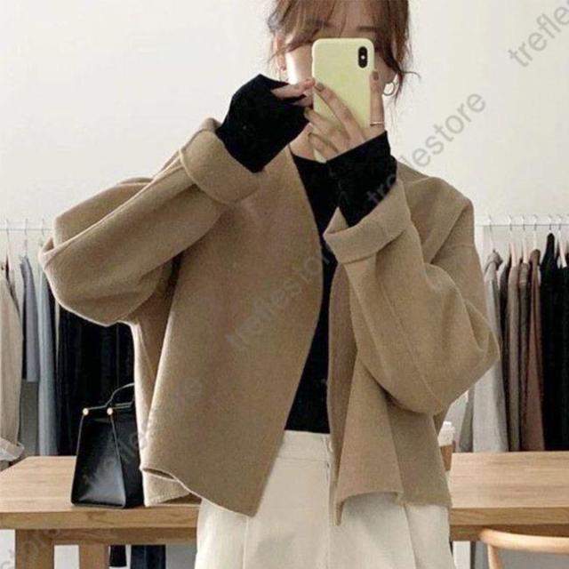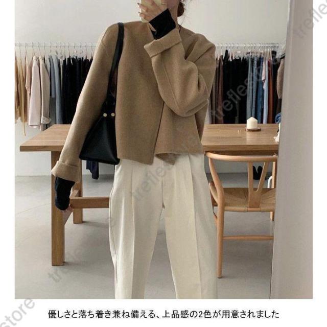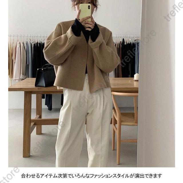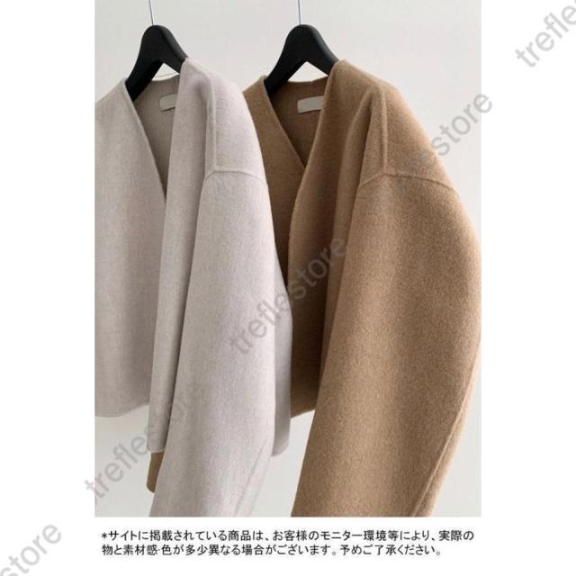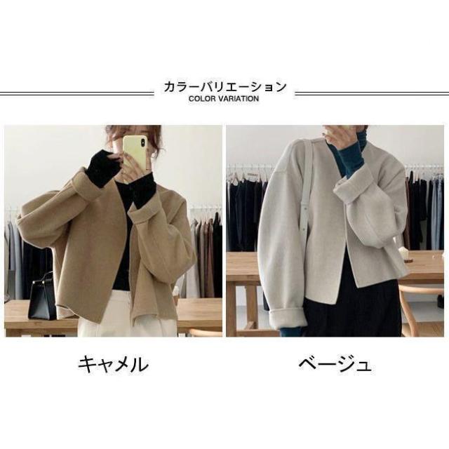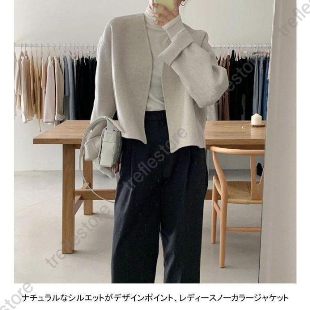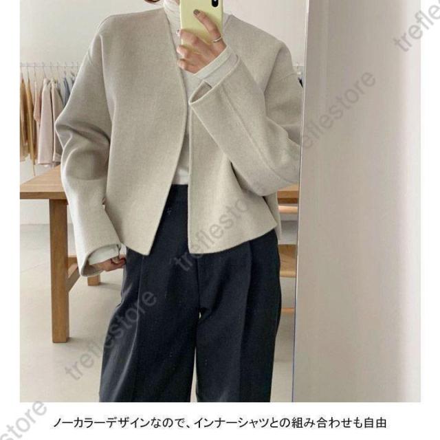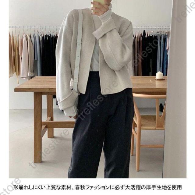 ノーカラー レディース 厚手 春 秋 冬 ツイード ラシャ アウター ショート ドロップショルダー 春 秋 ノーカラー ノーボタン カジュアル キャメル ベージュ