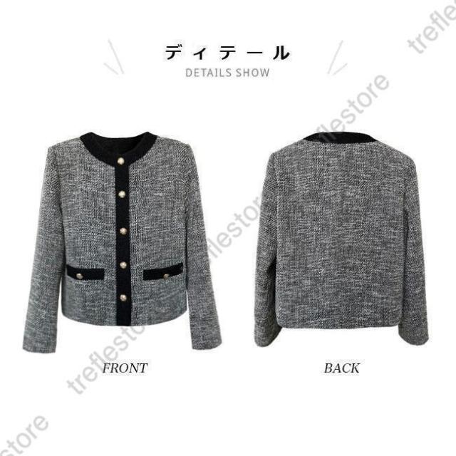 ツイードジャケット レディース ジャケット 秋 春 ノーカラージャケット キレイめ ツイード アウター ショート 通勤 レトロ フレンチ風 金属ボタン 長袖 秋ジャケット ノーカラー 春ジャケット ショートアウター グレー