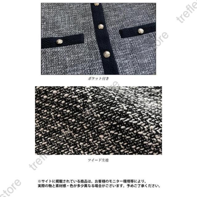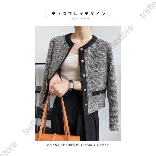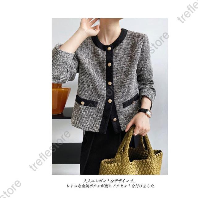 【ポイント5倍!】ツイードジャケット レディース ジャケット 秋 春 ノーカラージャケット キレイめ ツイード アウター ショート 通勤 レトロ フレンチ風 金属ボタン