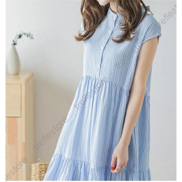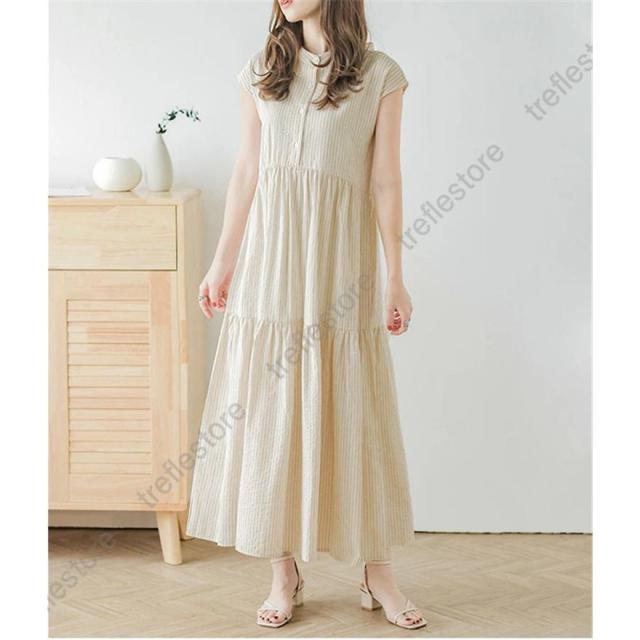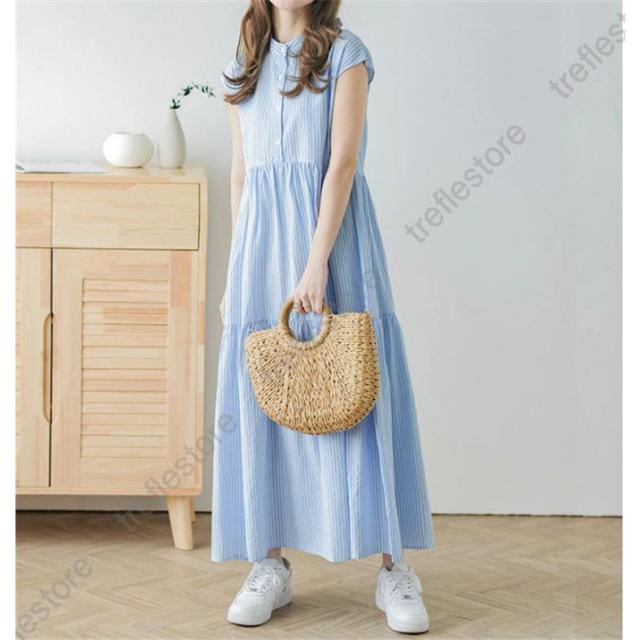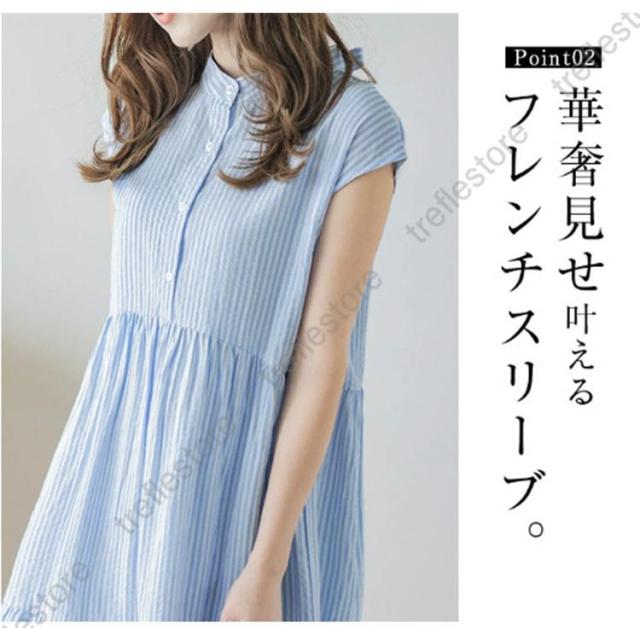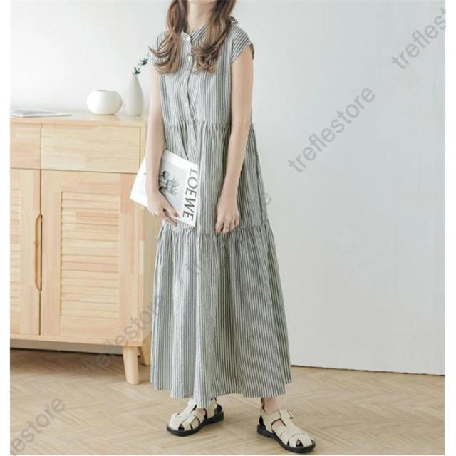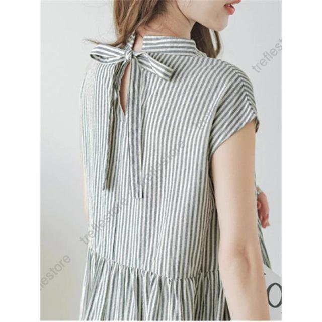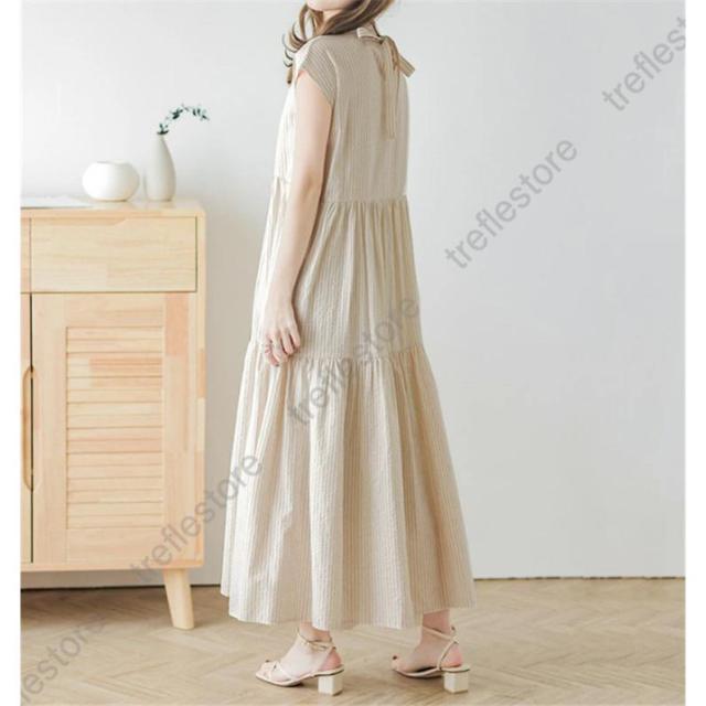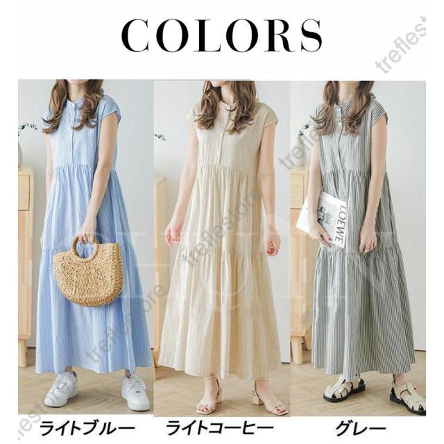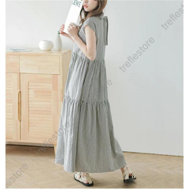【ポイント5倍!】シャツワンピース レディース スタンドカラーストライプワンピース ロング バックリボン カジュアル ティアードワンピース フレンチスリーブ 可愛い 春夏新作