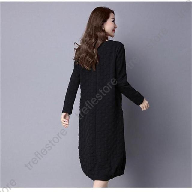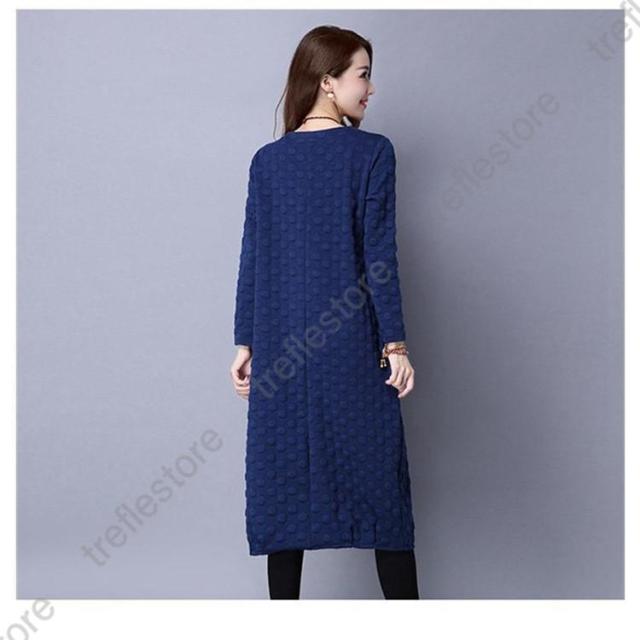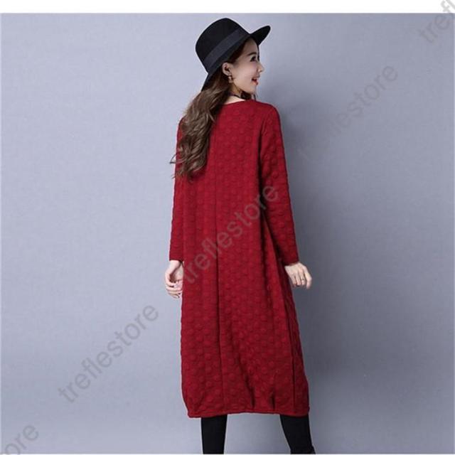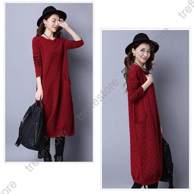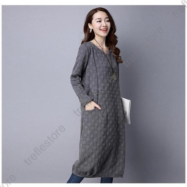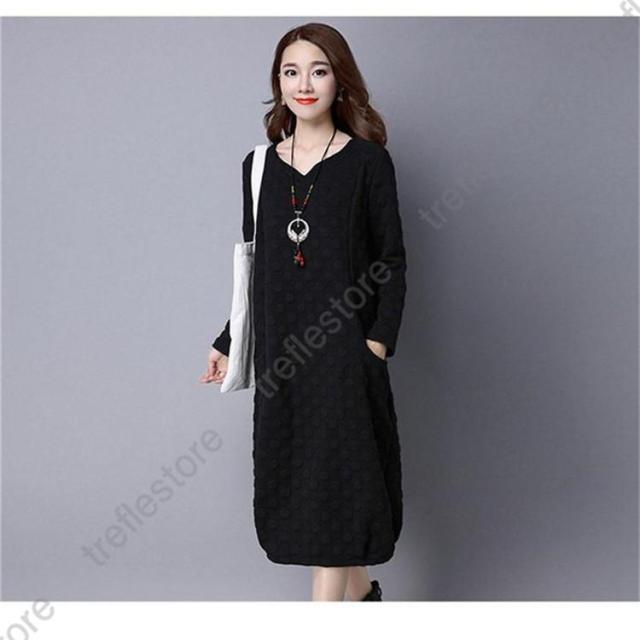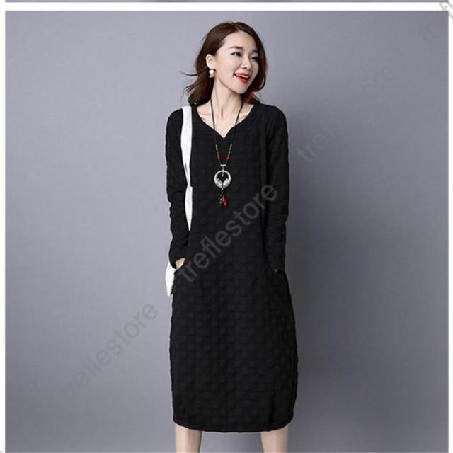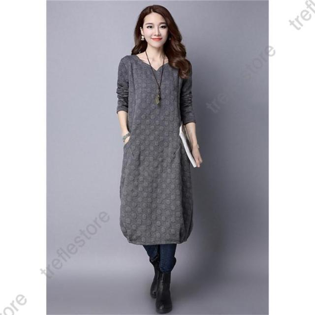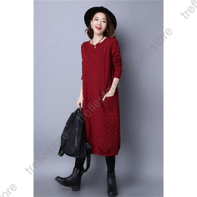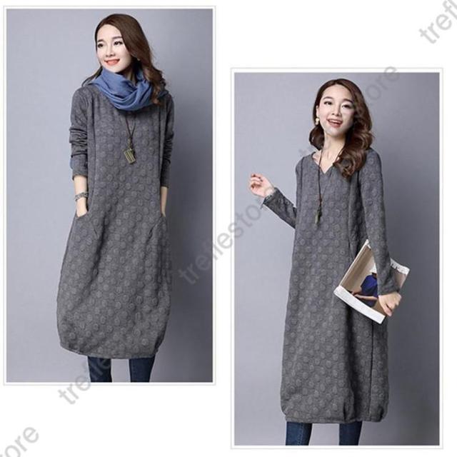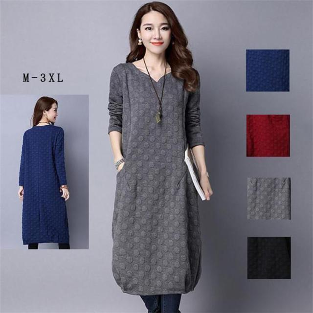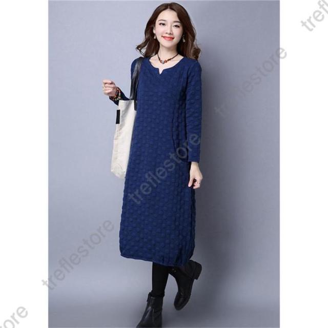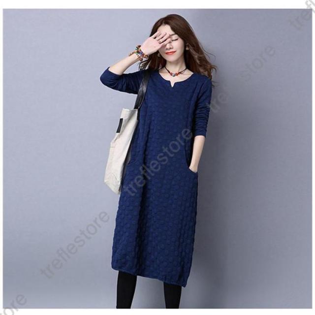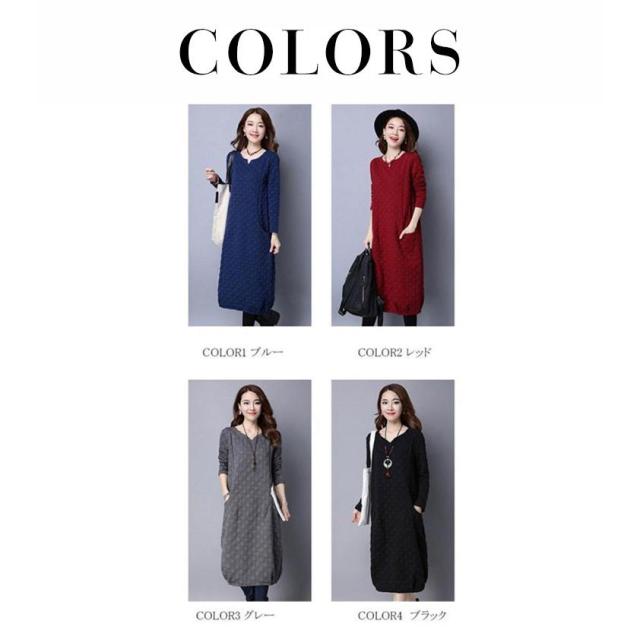 【ポイント5倍!】ワンピース レディース 秋冬 チュニック ロングワンピース 厚手 長袖 Vネック 綿混 ミモレ丈 体型カバー ゆったり 大きいサイズ 無地 暖かい OL