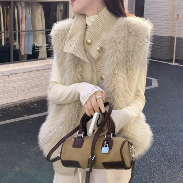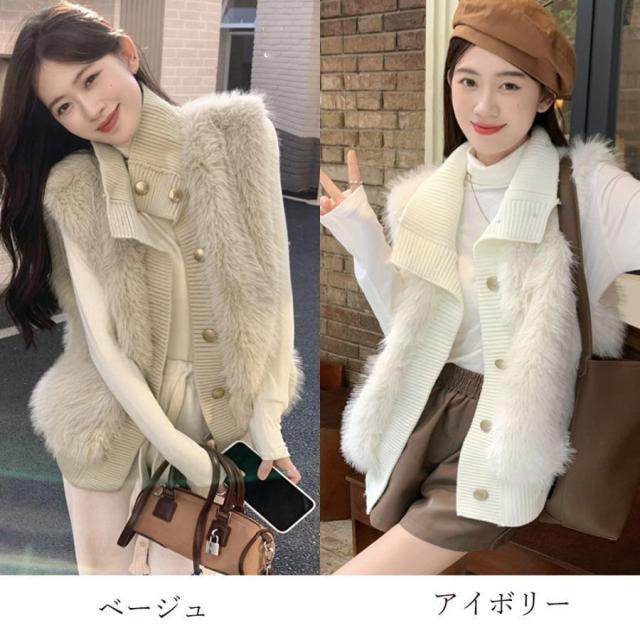 韓国 ファージレ きれいめ スタンドカラーファー 袖なしファーカーディガン 秋冬 ニットアウター 羽織り着やせ