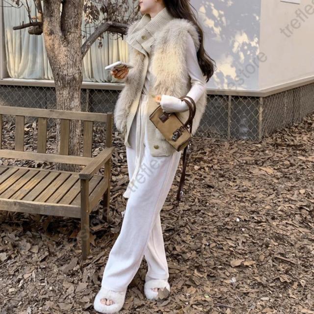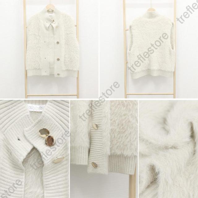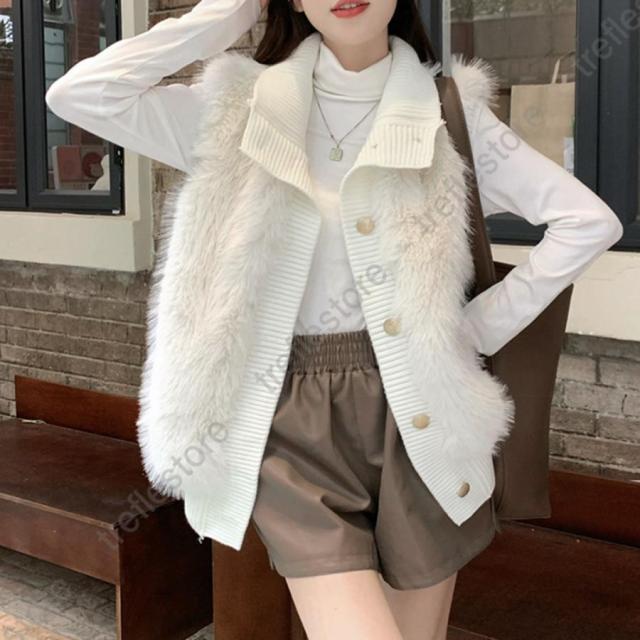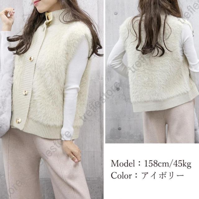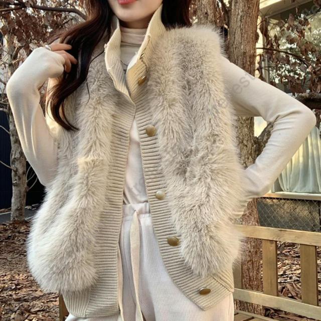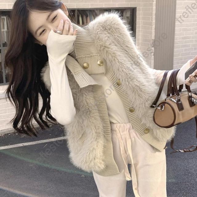 韓国 ファージレ きれいめ スタンドカラーファー 袖なしファーカーディガン 秋冬 ニットアウター 羽織り着やせ