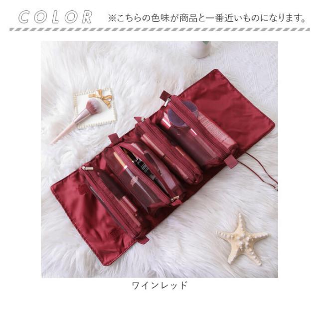 | 商品説明 | 【旅先でもサッと広げてメイクアップ】 ・コスメアイテムをひとまとめ。持ち運びも朝の身支度もスマート!折りたたみ式トラベルポーチ。 【取り外し可能な4メッシュポーチ】 ・内側にはファスナー式メッシュポーチが4つ。面ファスナーでサッと着脱OK。 (※1)大小それぞれ2つずつ、合計4つ付属しています。 【コスメやブラシもすっきり整頓】 ・ベースメイク、ポイントメイク、トラベルサイズのスキンケア、ブラシ類もすっきり仕分け。 【中身が見やすく通気性もばっちり】 ・中身が透けて見えるから、アイテムをすぐ見つけだせる!ちょこっと濡れても乾きやすい◎ 【くるっと丸めてかさばりにくい】 ・身支度を終えたら、丸めて両サイドのゴムで固定。キャリーケースやトラベルバッグにすっぽり。 (※2)ゴムはドローコード式で調節可能です。 【壁掛けできて便利な吊り下げ式】 ・まとめるゴムを使って、洗面台などに吊り下げ。スペースの限られた洗面でも、スムーズに準備♪ (※3)重さがある場合は吊り下げを控えてください。 【お気に入りを選べるカラー】 ・ベーシックやアクセントになるカラーをラインナップ。表面にロゴが入ったシンプルデザイン。 |