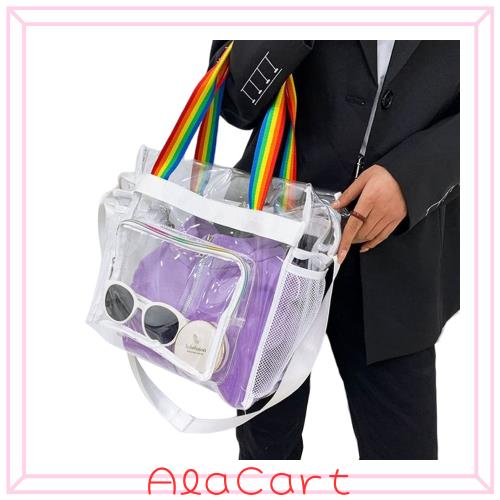 【商品仕様】:サイズ(約):縦30?×横30?×幅15?、重量:約350g。素材:PVC、ナイロン。透明のデザインなので、バッグの中身がひと目で確認できます。軽量で持ちやすく、レディースでもメンズでもOK!春夏秋冬、季節を問わずにハンドバッグとショルダーバッグとしてご使用いただけます。