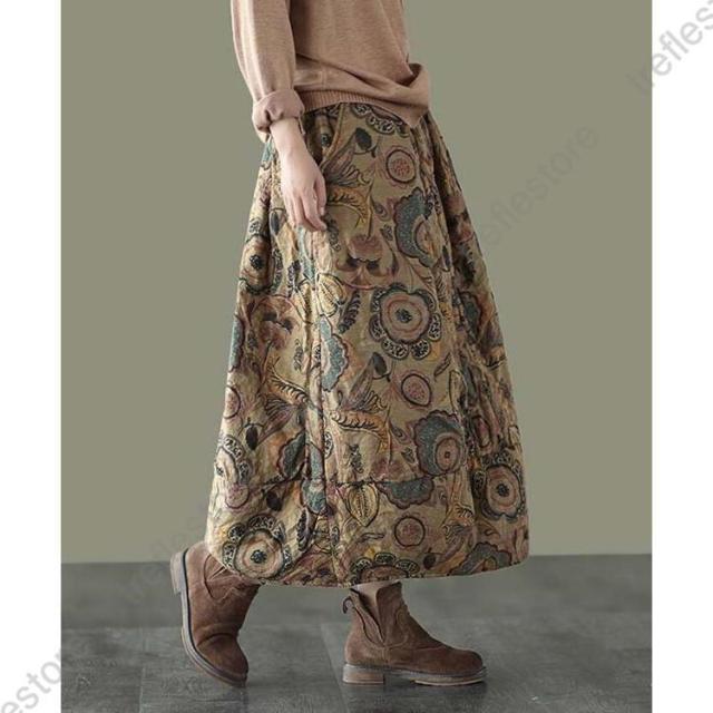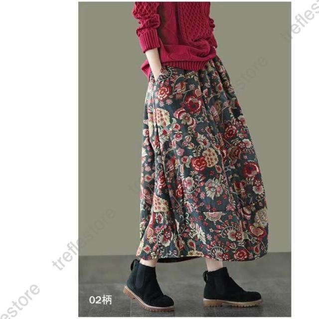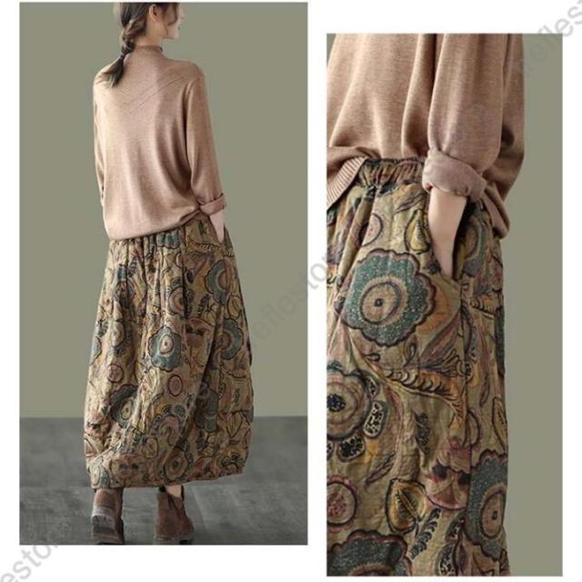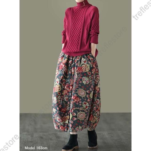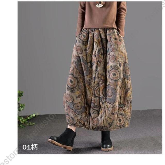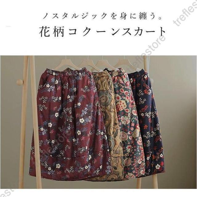 【ポイント5倍!】スカート ロングスカート コクーンスカート 花柄 フレア 中綿 ボトムス レディース 大きいサイズ 体型カバー 冬 ウエストゴム ロング丈 秋冬