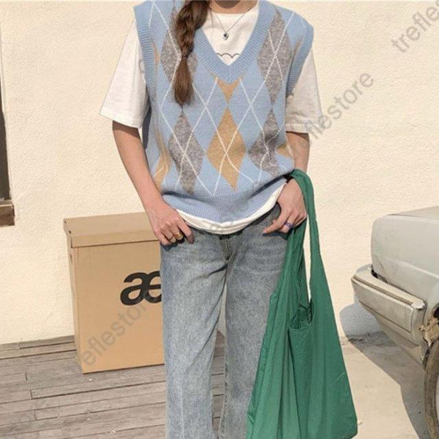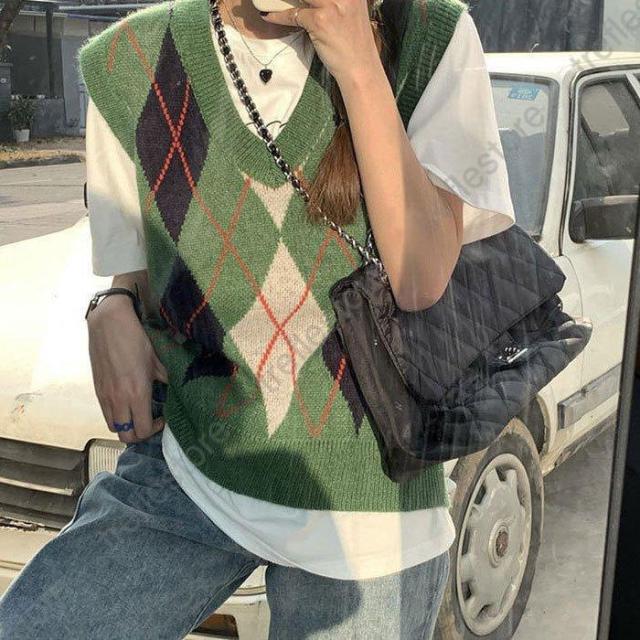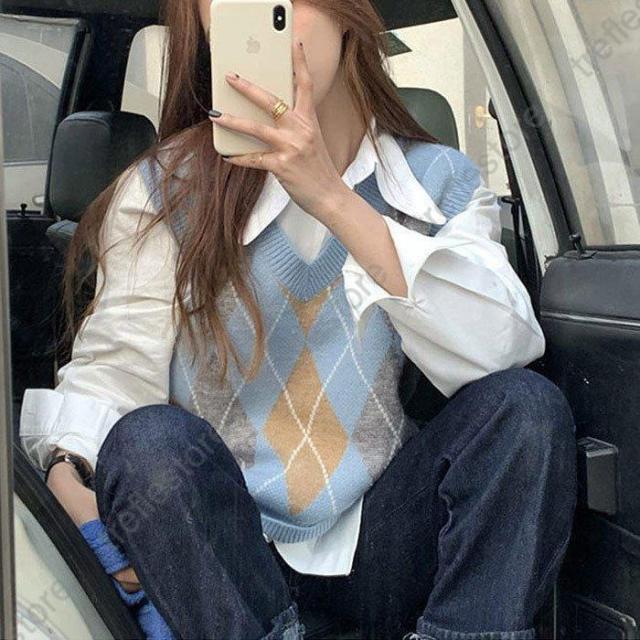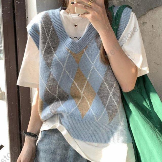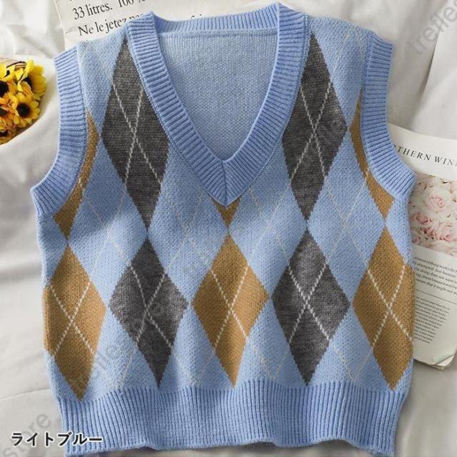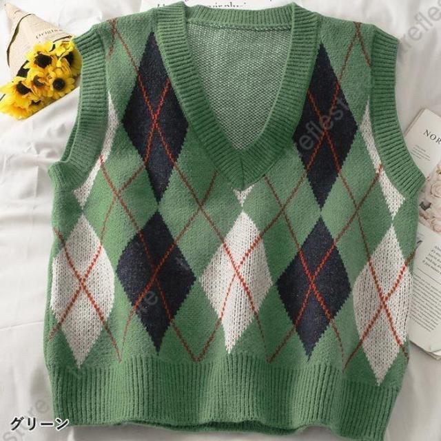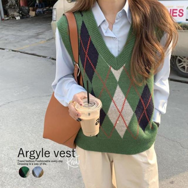 【ポイント5倍!】ニットベスト ニット レディース チェック柄 アーガイル 前開き トップス 韓国 部屋着 防寒
