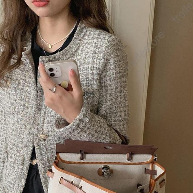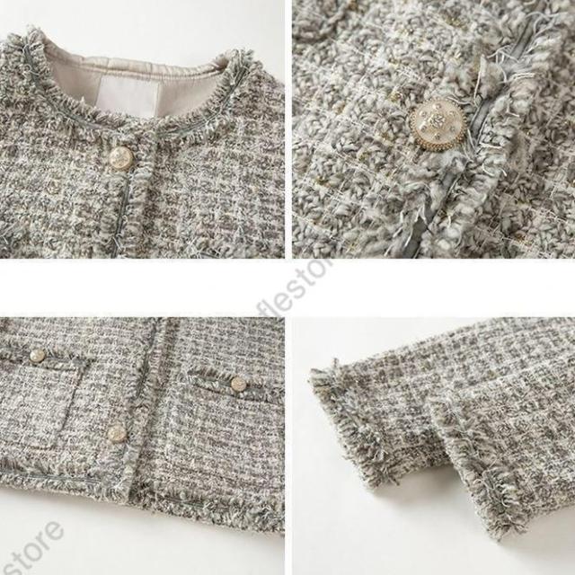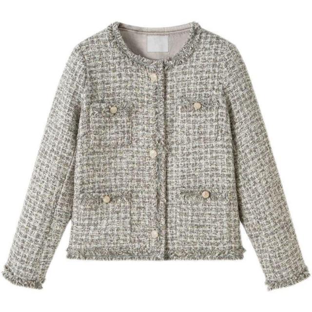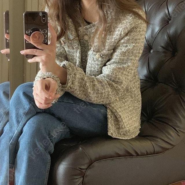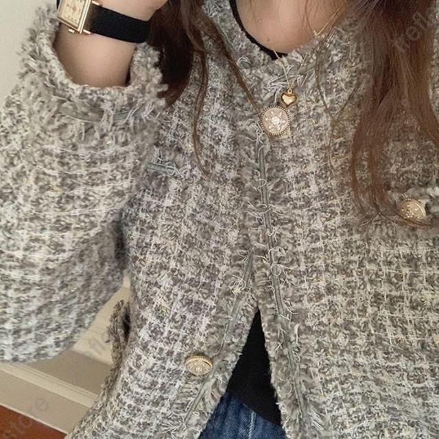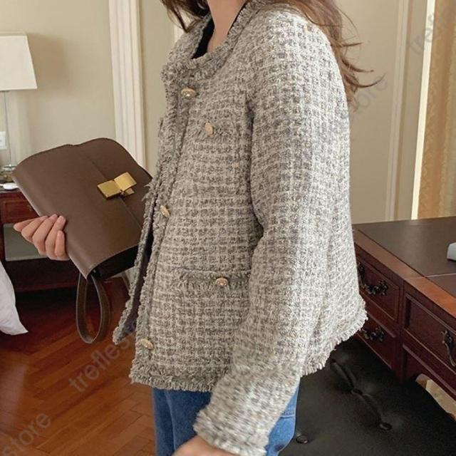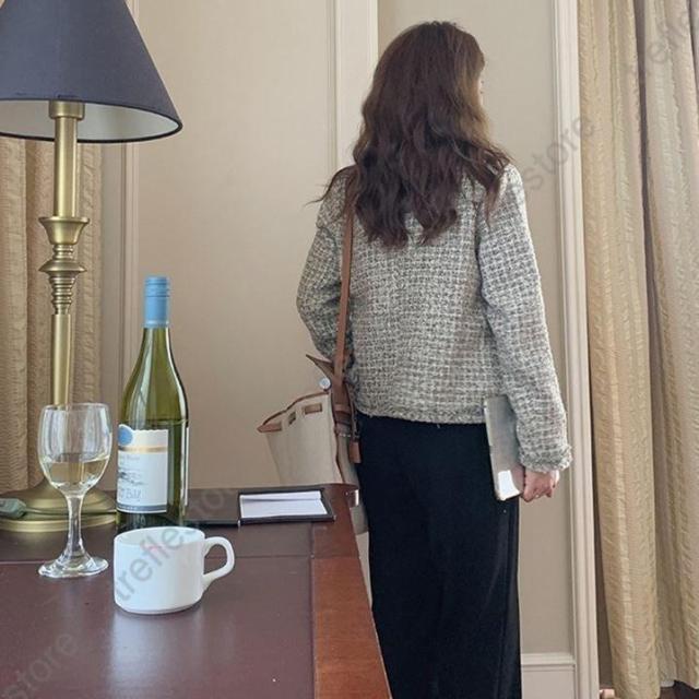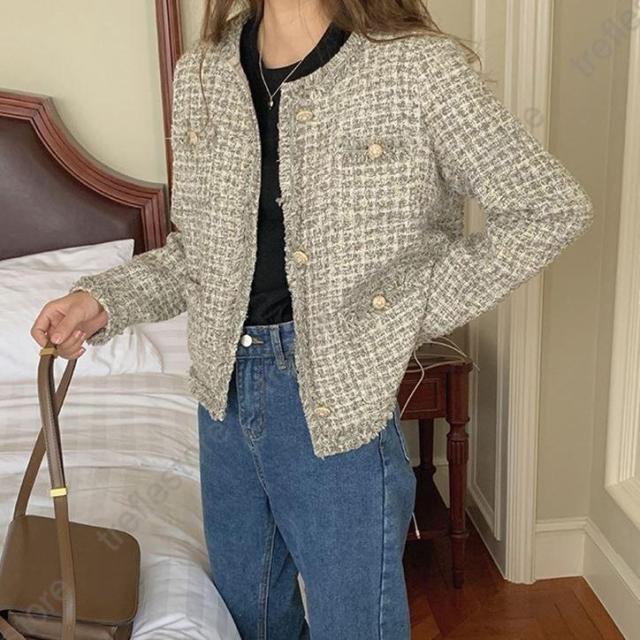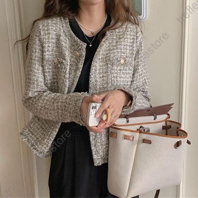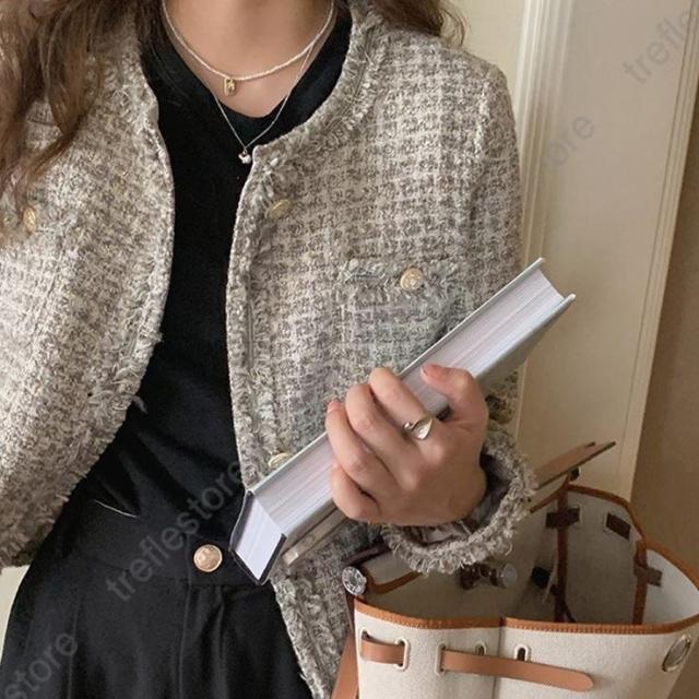【ポイント5倍!】ノーカラージャケット ショート丈 チェック柄 ノーカラー 襟なし きれいめ エレガント 韓国 秋冬 通勤 お出かけ デート レトロ レディース ツイード風