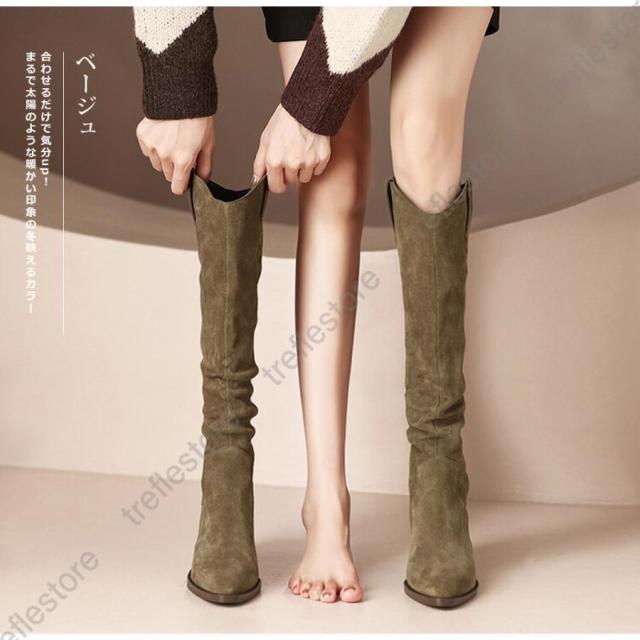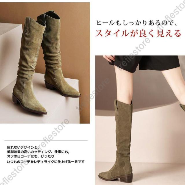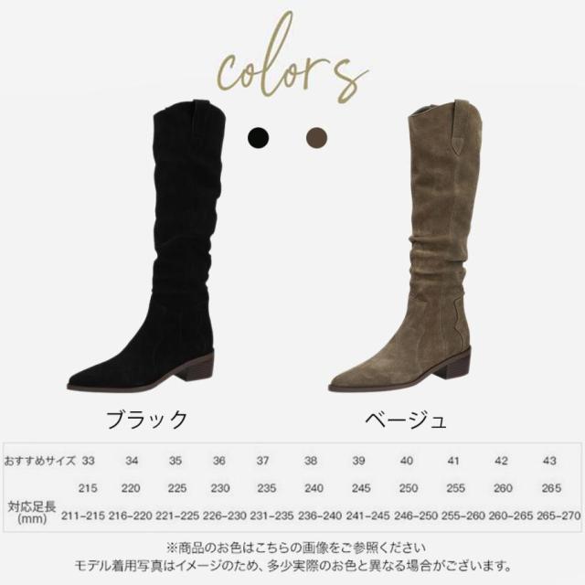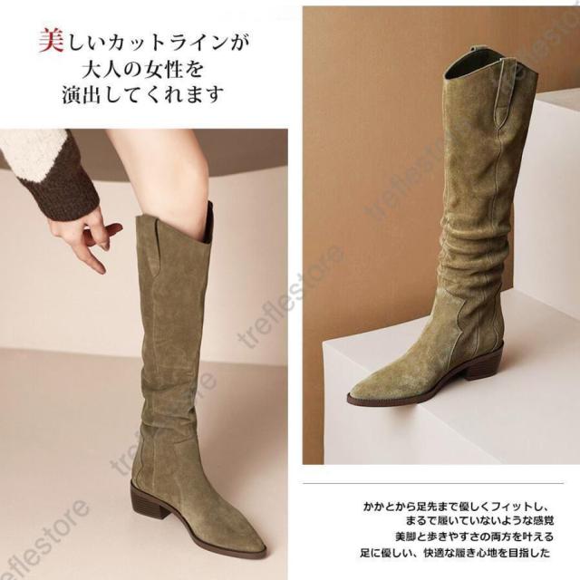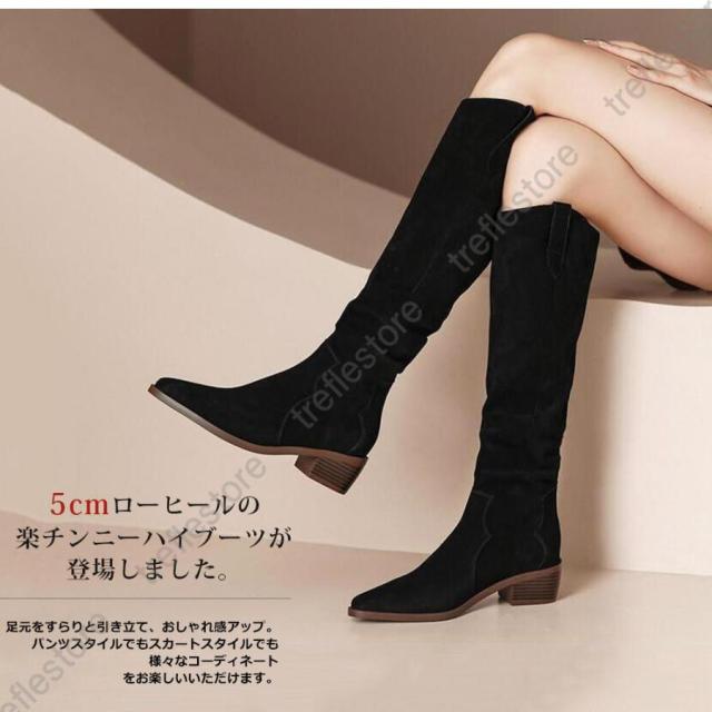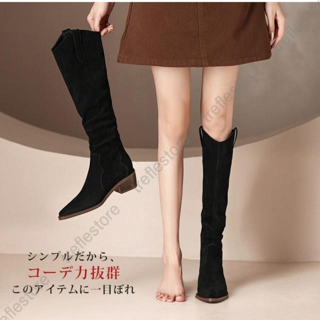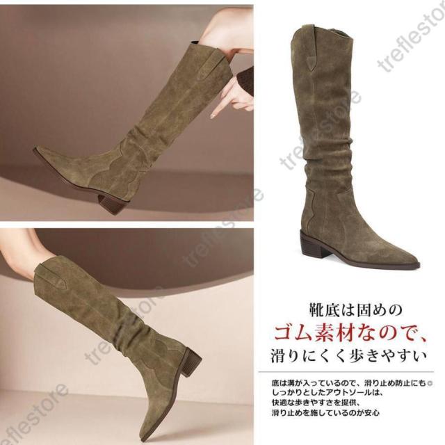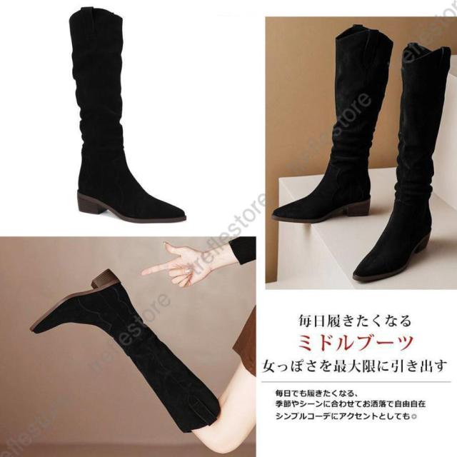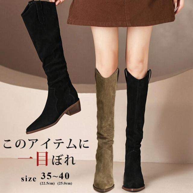 【ポイント5倍!】ロングブーツ レディース ジョッキーブーツ ロング丈 ポインテッドトゥ スエード調 太めヒール ローヒール 美脚ブーツ 黒 可愛い シンプル 美脚 おしゃれ 通勤