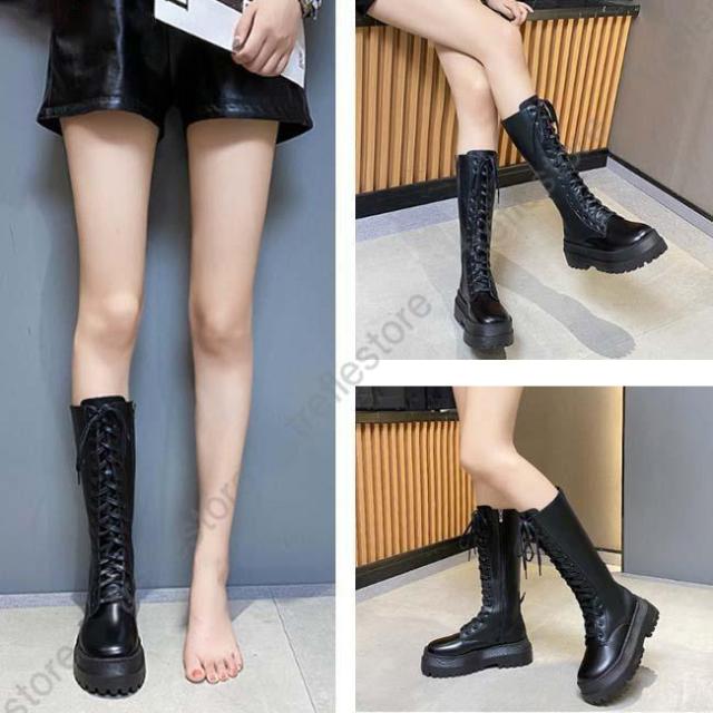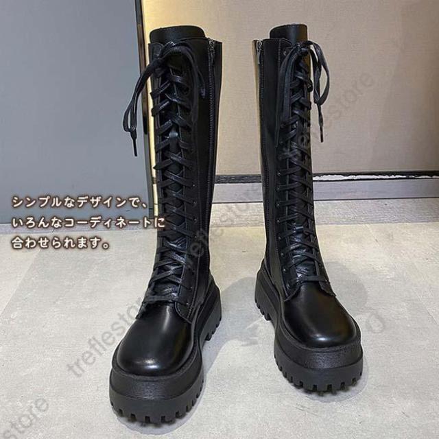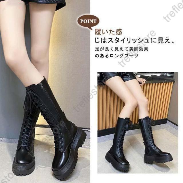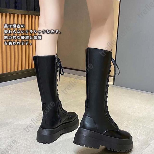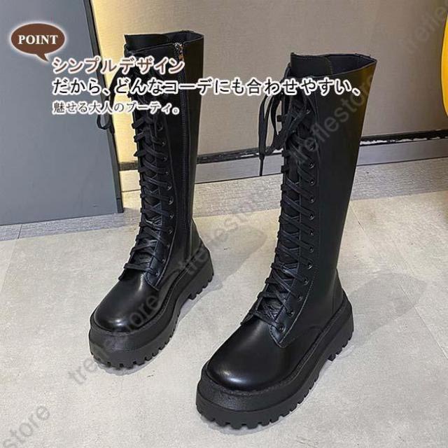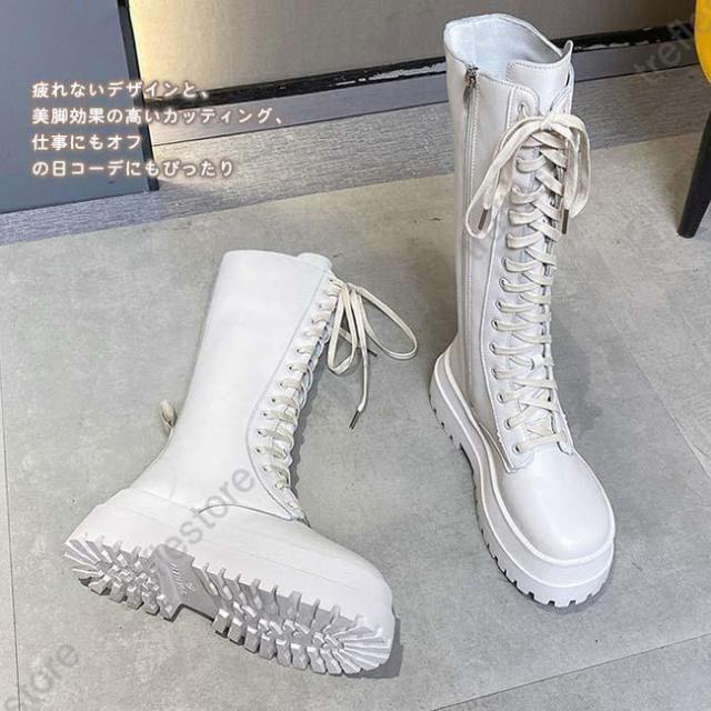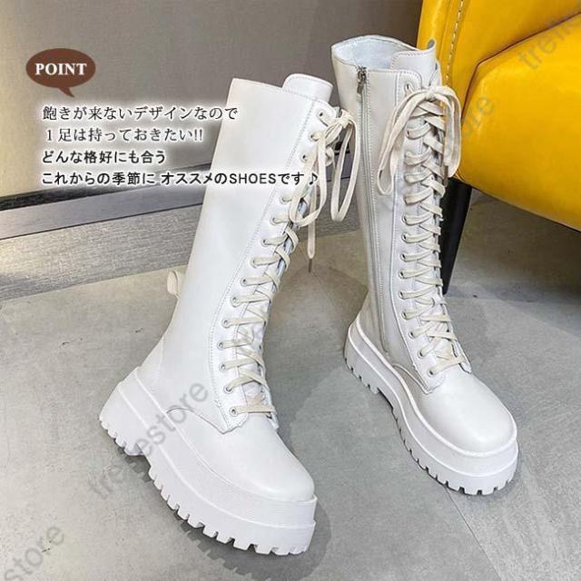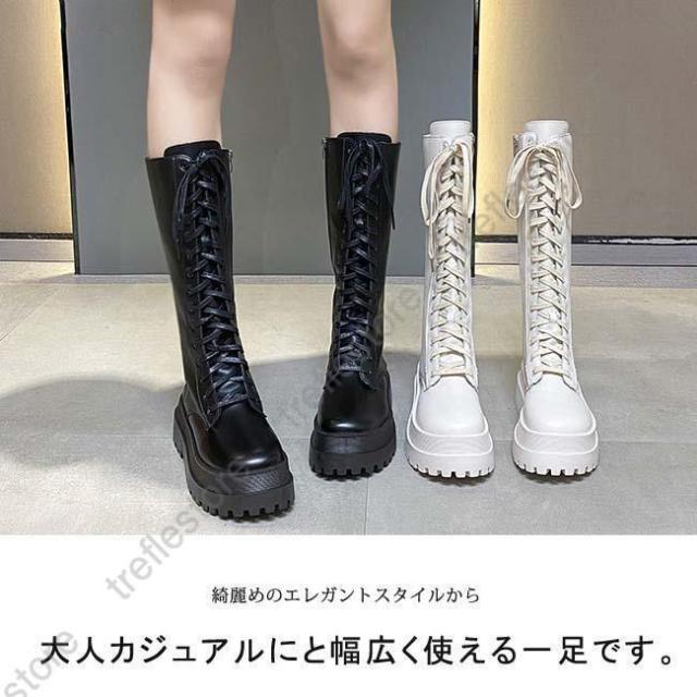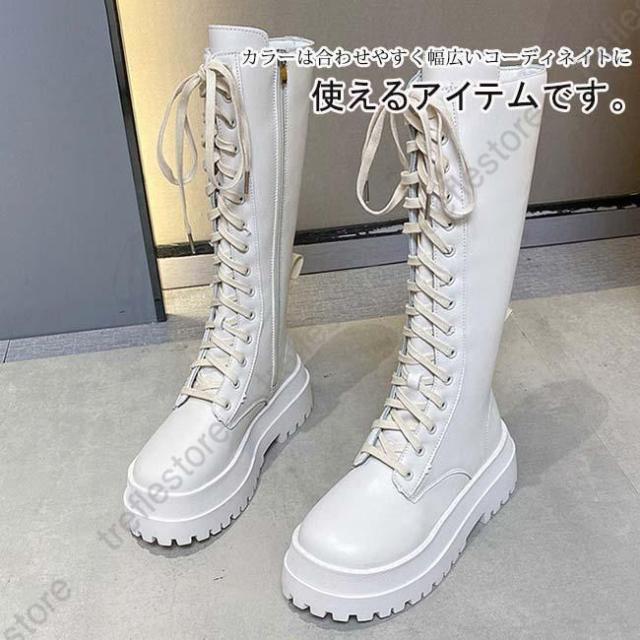 【ポイント5倍!】ロングブーツ 厚底 レディース ラウンドトゥ サイドファスナー付き ブーツ ロング レースアップ 編み上げ 美脚 おしゃれ カジュアル 履きやすい 歩きやすい 白