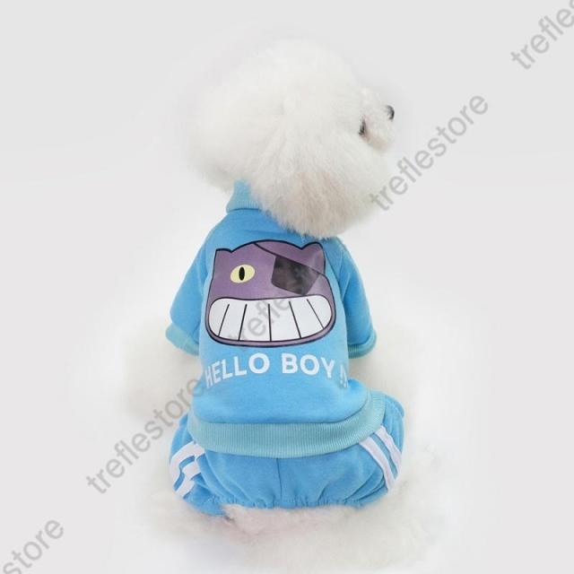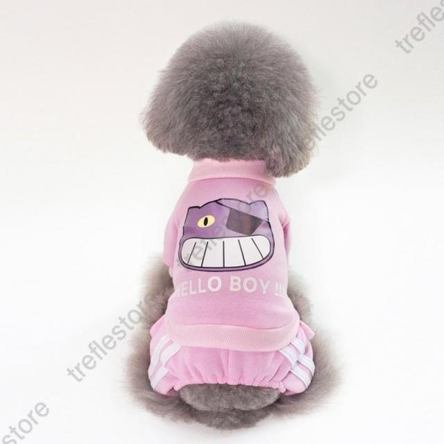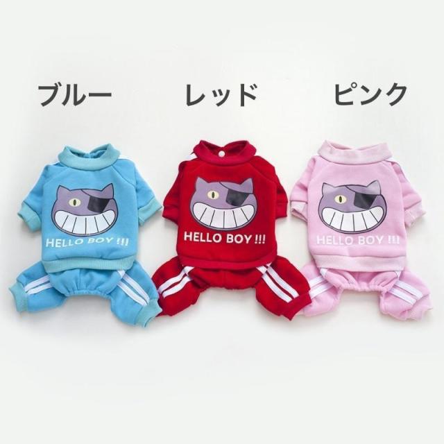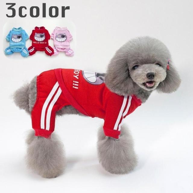 【ポイント5倍!】ペットウェア ドッグウェア カバーオール 犬用 ロンパース つなぎ 洋服 カジュアル ジャージ風 ライン ネコ 猫 イラスト プリント おしゃれ かわ