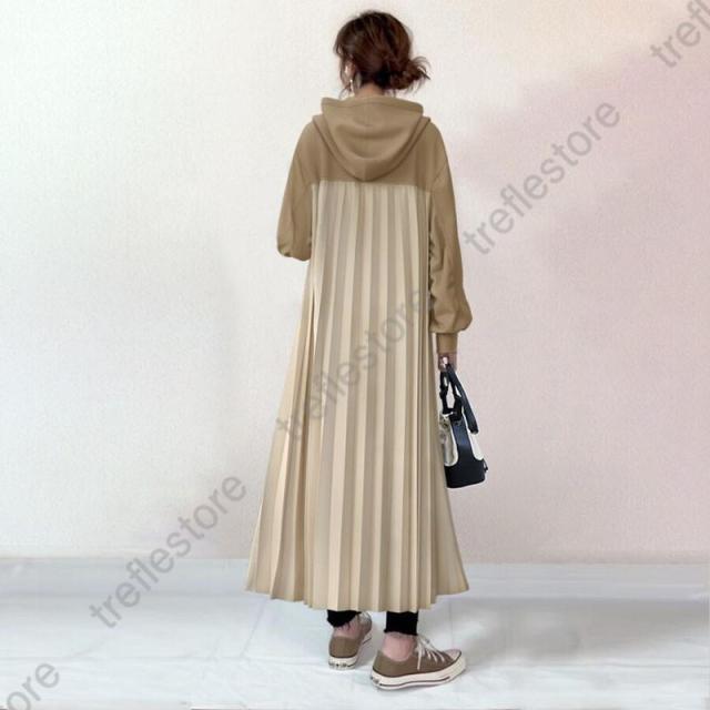 ワピース ディース マキシワピース 配色 カジュアル エガ 切り替え ギャザー フード付き 長袖 リーツ 体型カバー 50代 40代 30代 秋冬コーデ