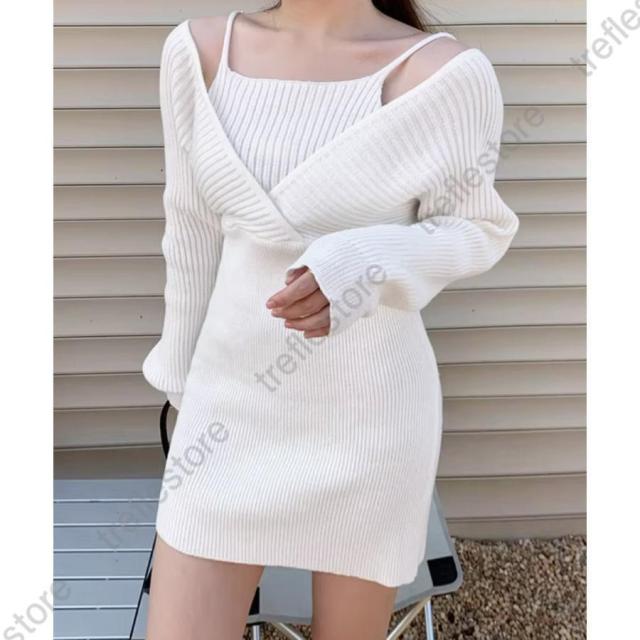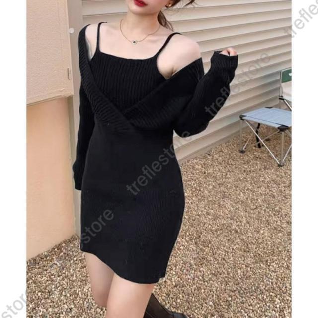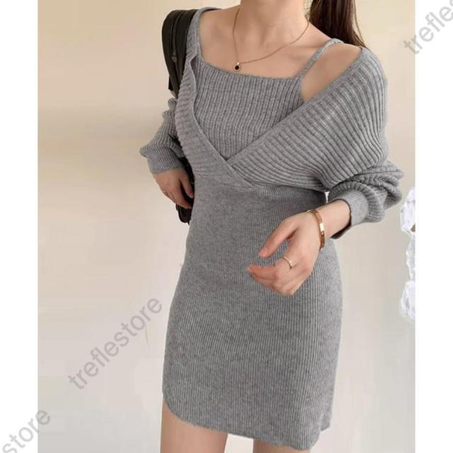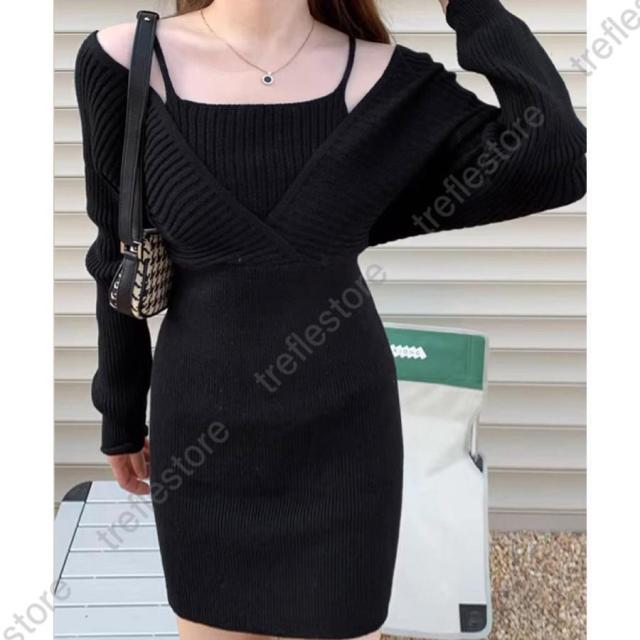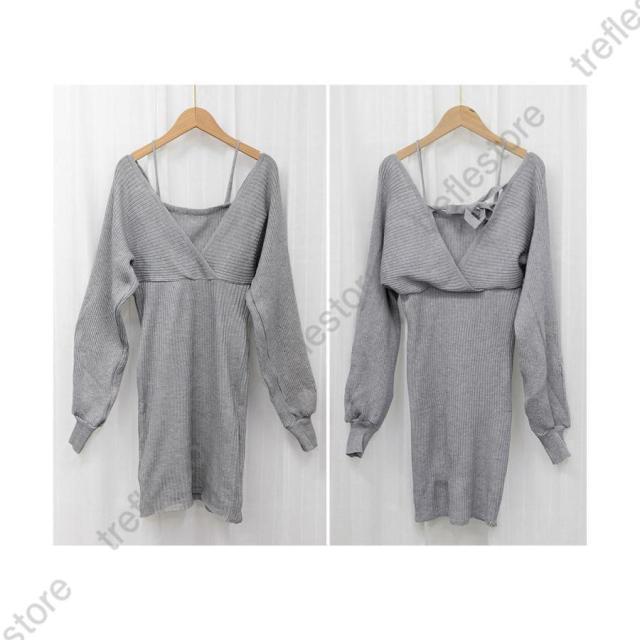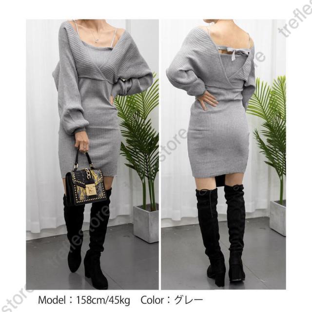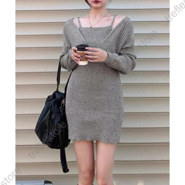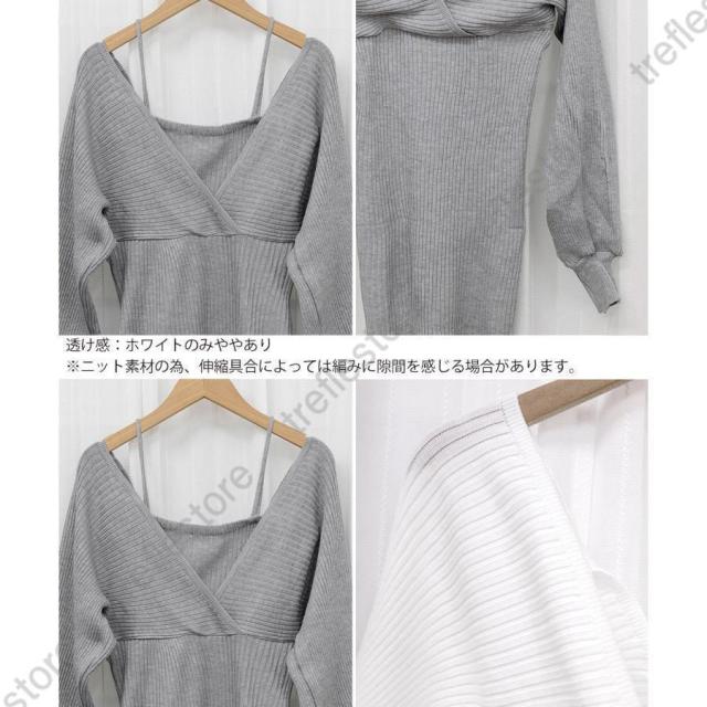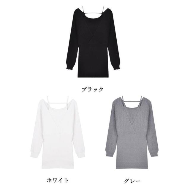 レディース おしゃれ 秋冬 ニットタイトワンピース オフショルダー レイヤード風 膝上丈ワンピ長袖 韓国ボディコンワンピ