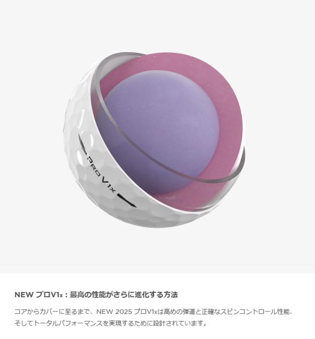 ≪Pro V1x≫ プロV1xは飛距離の最大化と理想的な中高弾道、そしてグリーンでしっかりとボールを止められる性能を求めるプレーヤーに最適なトータルパフォーマンスボールです。 プロV1xは、中高弾道の飛び、ロングゲームでスピン量を抑え、ショートゲームで優れたスピンコントロール性能を発揮し、芯を感じるソフトな打感を求めるプレーヤーにおすすめです。 独自のディンプルパターンによって、プロV1xはプロV1よりも高めの弾道となります。また、NEW ハイスピード・ハイグラディエント・デュアルコアにより、アイアンショットやウェッジショットで、プロV1よりもややスピン量が多めです。