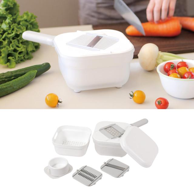 野菜の下ごしらえに欠かせないスライサー・安全ホルダー・ザル・ボウル・フタのセットです。かさばりがちな調理器具を1つにまとめた便利なセットです。