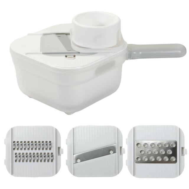 プレートを付け替えて3種類のカットが可能です。幅広のプレートで大きめの野菜でもカットしやすく、おろしプレートの刃にはエッチング加工が施されているので、軽い力でおろしができます。野菜を押さえる安全ホルダー付きです。