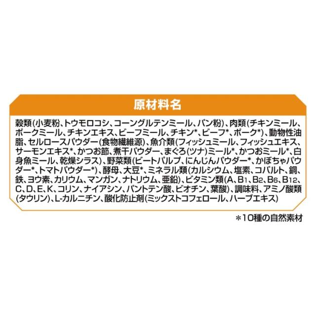 | 穀類(小麦粉、トウモロコシ、コーングルテンミール、パン粉)、肉類(チキンミール、ポークミール、チキンエキス、ビーフミール、チキン*、ビーフ*、ポーク*)、動物性油脂、セルロースパウダー(食物繊維源)、魚介類(フィッシュミール、フィッシュエキス、サーモンエキス*、かつお節、煮干パウダー、まぐろ(ツナ)ミール*、かつおミール*、白身魚ミール、乾燥シラス)、野菜類(ビートパルプ、にんじんパウダー*、かぼちゃパウダー*、トマトパウダー*)、酵母、大豆*、ミネラル類(カルシウム、塩素、コバルト、銅、鉄、ヨウ素、カリウム、マンガン、ナトリウム、亜鉛)、ビタミン類(A、B1、B2、B6、B12、C、D、E、K、コリン、ナイアシン、パントテン酸、ビオチン、葉酸)、調味料、アミノ酸類(タウリン)、L-カルニチン、酸化防止剤(ミックストコフェロール、ハーブエキス)*10種の自然素材 |