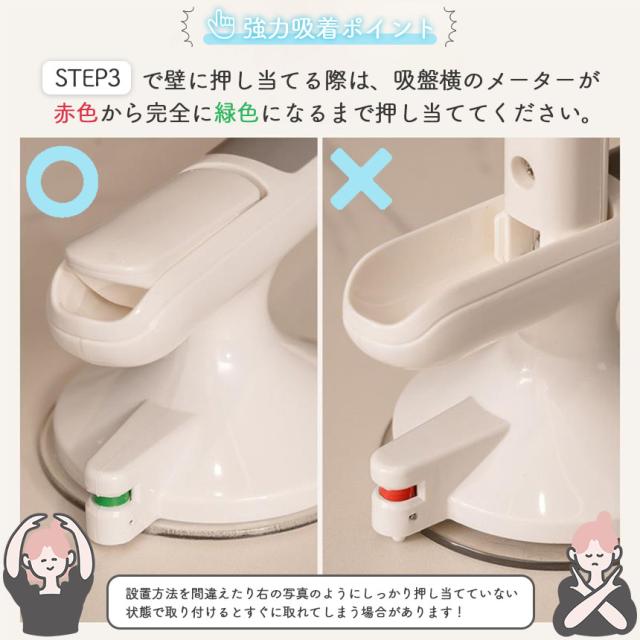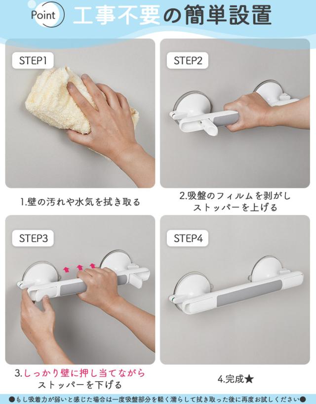 ※間違った方法で取り付けたり、吸盤接着が不向きな壁に取り付けると手すりがしっかり固定されず落ちてしまいますのでお気を付けください。