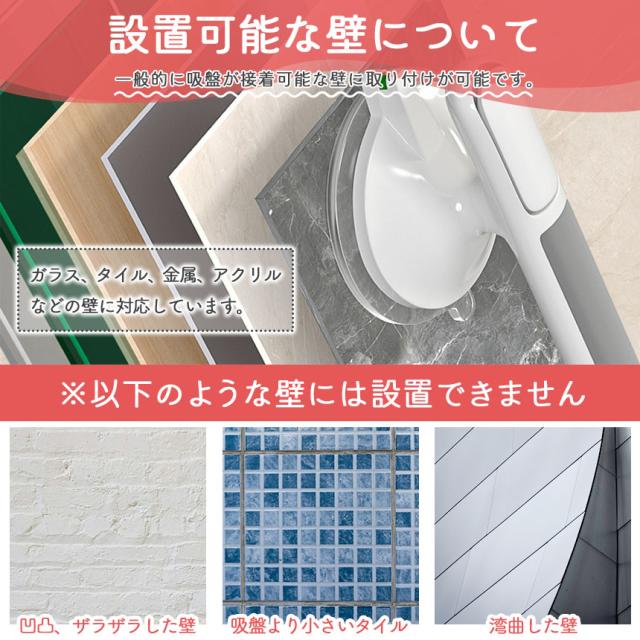 凹凸がありザラザラとした壁や、吸盤の直径より小さいタイル、カーブしている壁などは取り付け不可ですのでご確認ください。