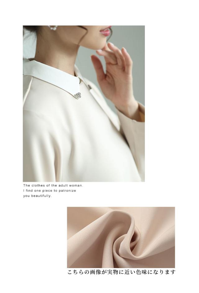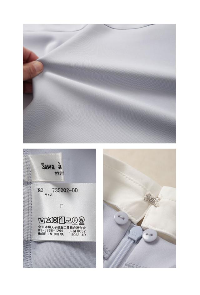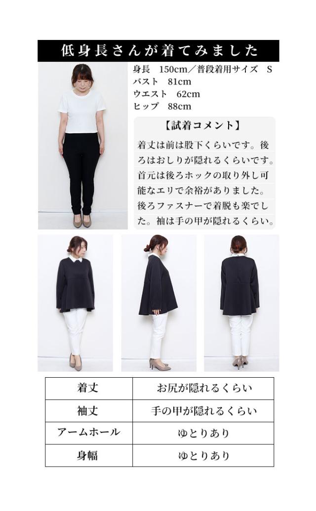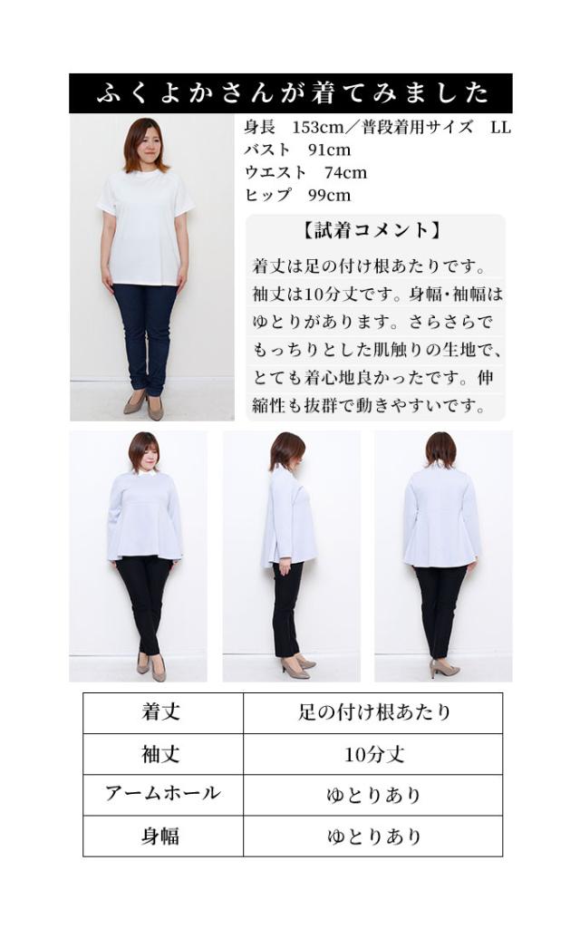 着丈は足の付け根あたりです。袖丈は10分丈です。身幅・袖幅はゆとりがあります。さらさらでもっちりとした肌触りの生地で、とても着心地良かったです。伸縮性も抜群で動きやすいです。ペプラム調のシルエットで体のラインを拾わずゆったりと着用できます。内側のボタンで付け外し可能な襟にはラインストーンがあしらわれ顔周りが華やぎます。