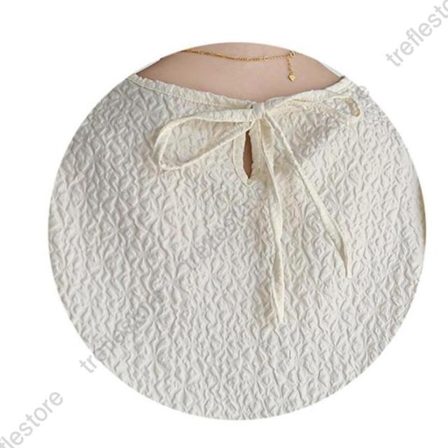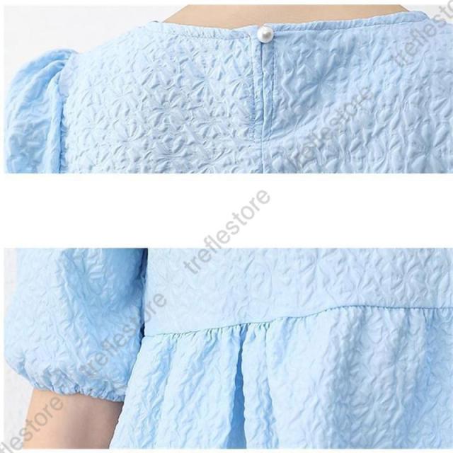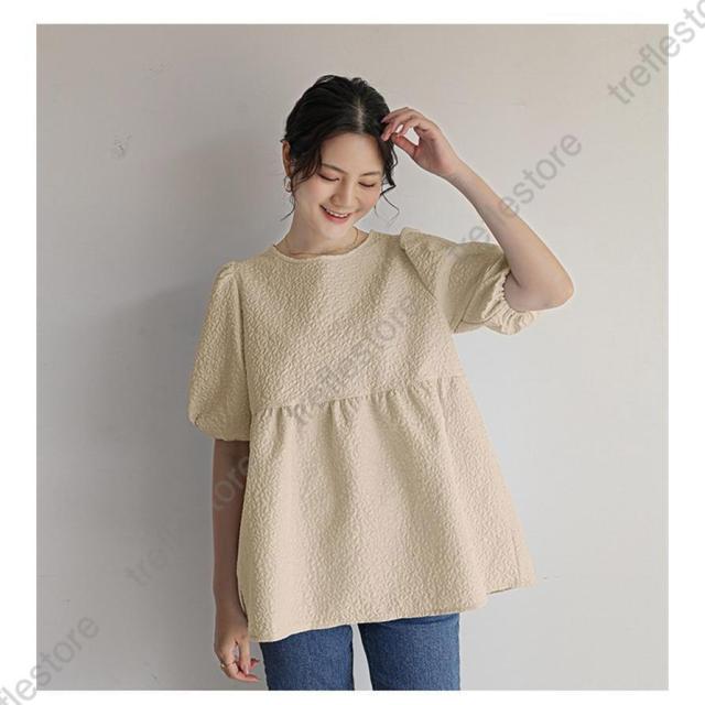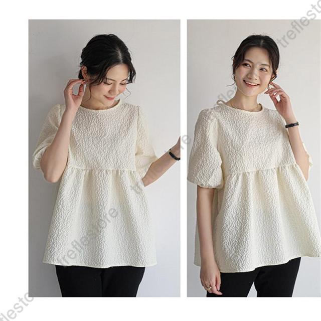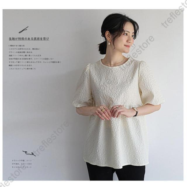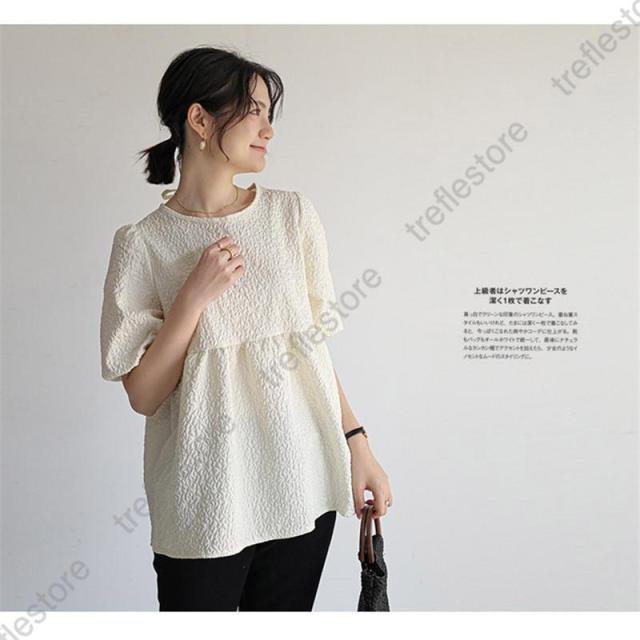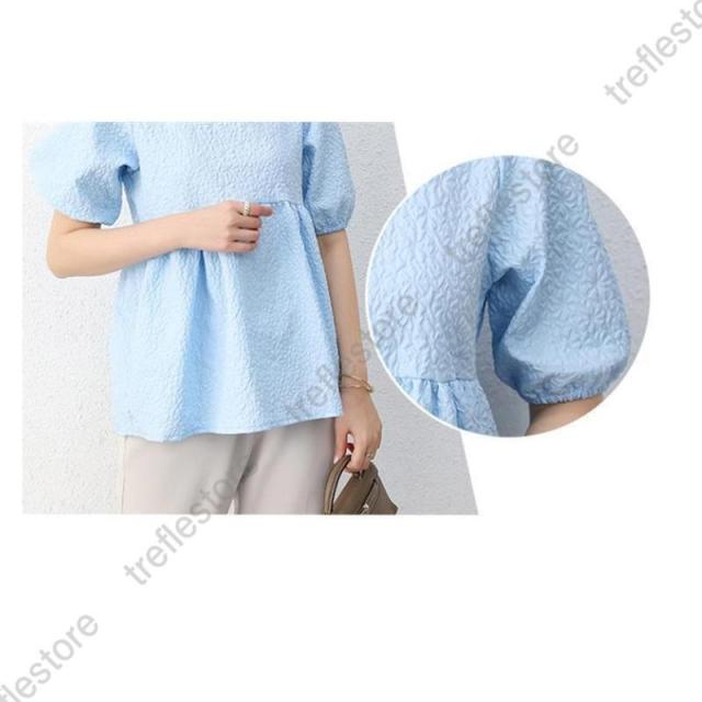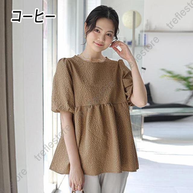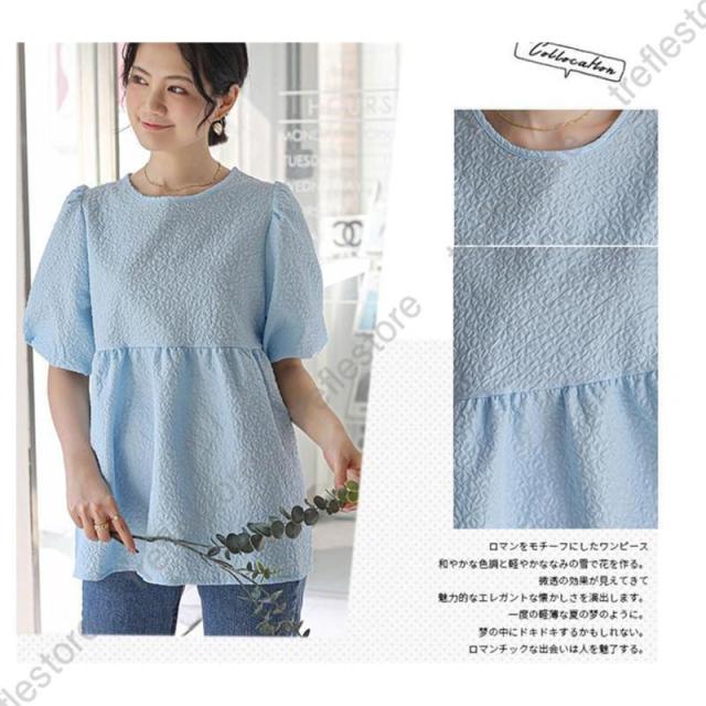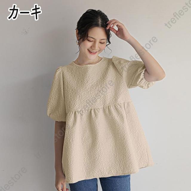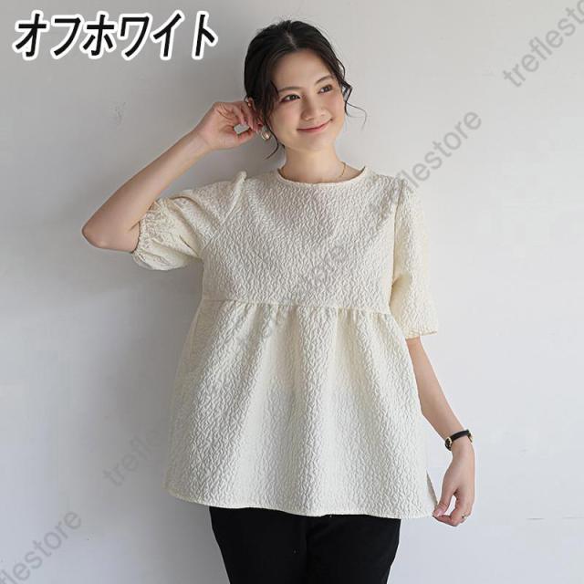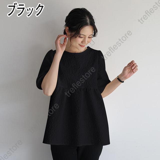 【ポイント5倍!】カットソー レディース ブラウス Tシャツ 半袖 tシャツ パフスリーブ エンボス加工 ペプラム バッグリボン トップス 夏服 着痩せ おしゃれ