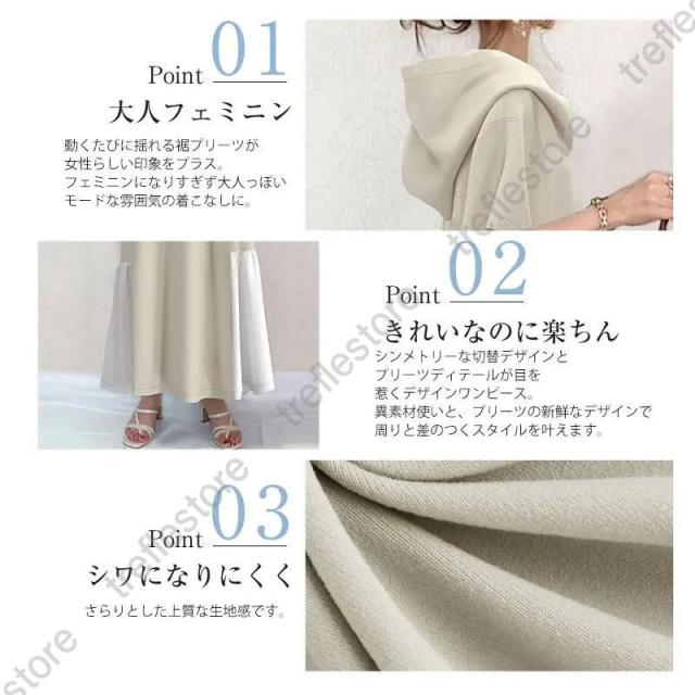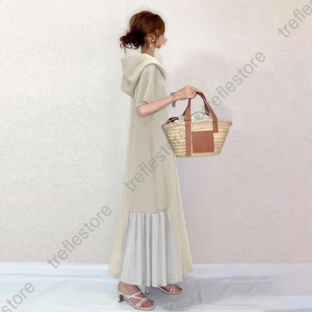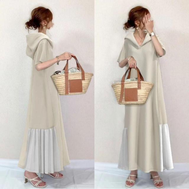 【ポイント5倍!】ワンピース ロング 夏 切替 裾サイドプリーツ フード付き 半袖 着痩せ フォーマル レディース 夏服 vネック aライン 夏ワンピース 40代 50代 30代 ol アジアン