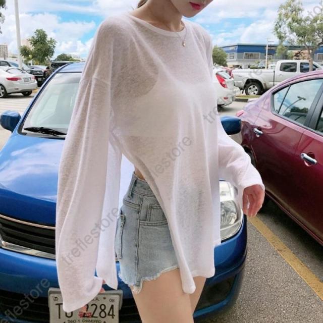 ビーチウェア ラッシュガード Tシャツ レディース トップス 長袖 カバーアップ オーバーサイズ ビッグシルエット ゆったり 体型カバー 露出少なめ 日焼け防止 白 夏 水着 ラッシュTシャツ 透け感 シースルー 肌見せ スリット シンプル 海 ビーチ リゾート 20代 30代 40代