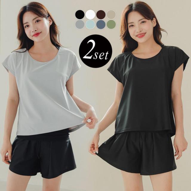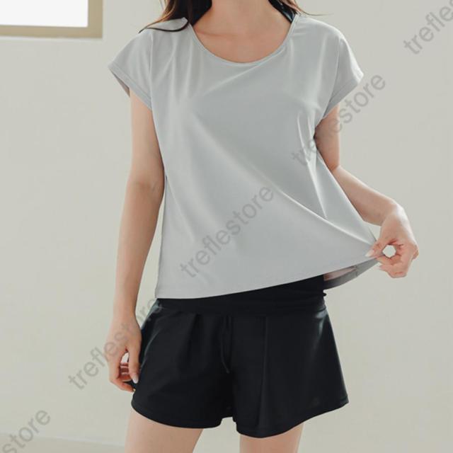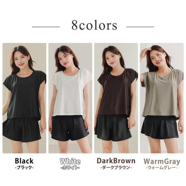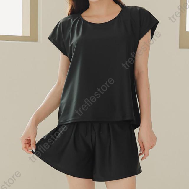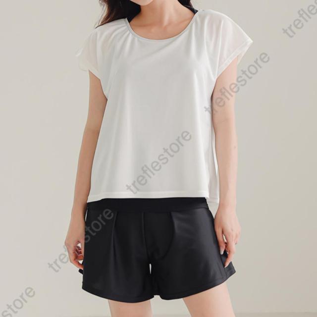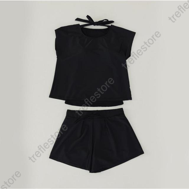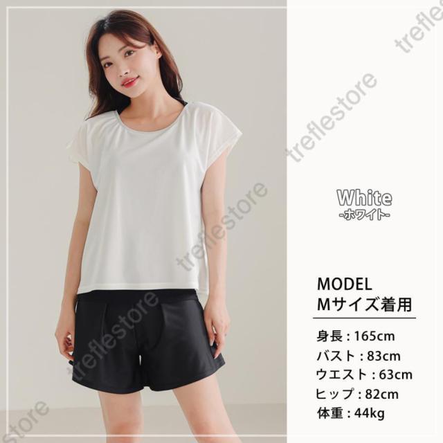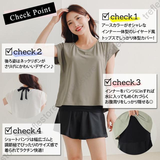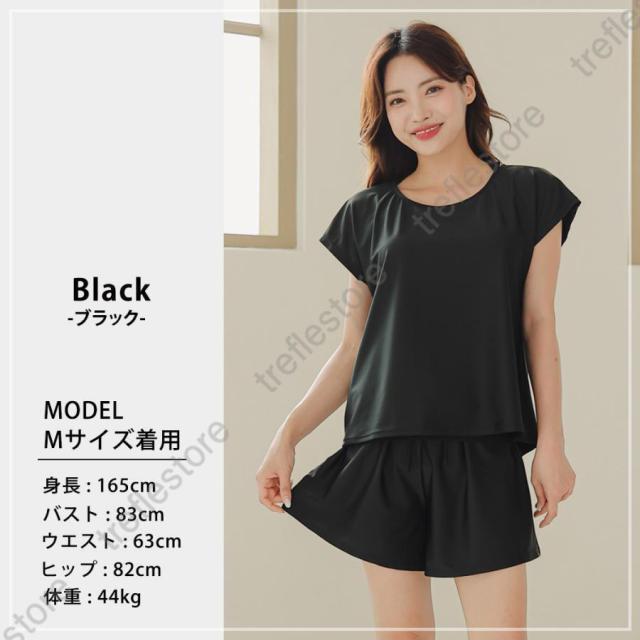 【ポイント5倍!】水着 レディース 体型カバー ママ水着 セパレート 大きいサイズ レイヤード風 半袖ラッシュガード ショートパンツ 2点セット 黒 白