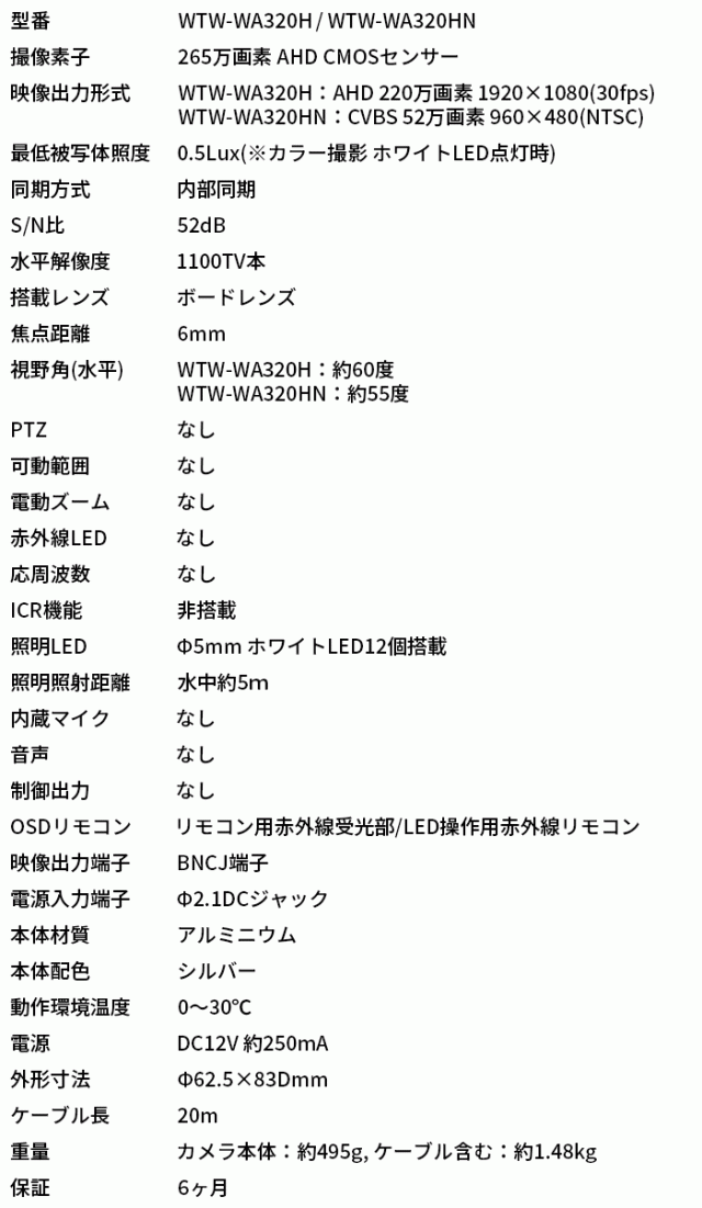 ■ WTW-WA320H/HN | 水深10m対応ホワイトLED搭載水中カメラ20mケーブル仕様【防犯カメラ】【監視カメラ】【セキュリティーカメラ】【塚本無線】
