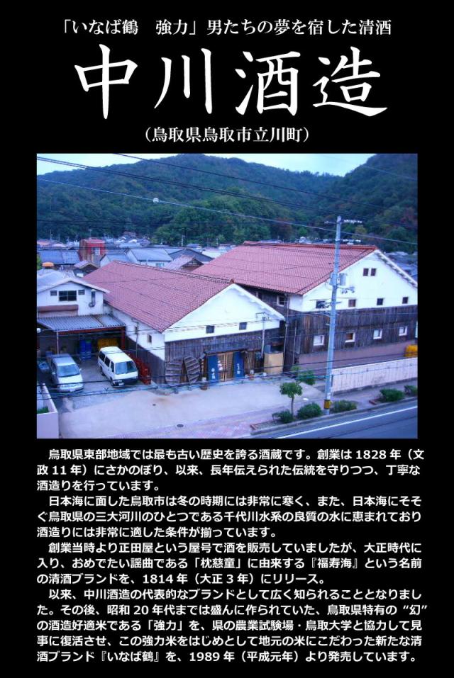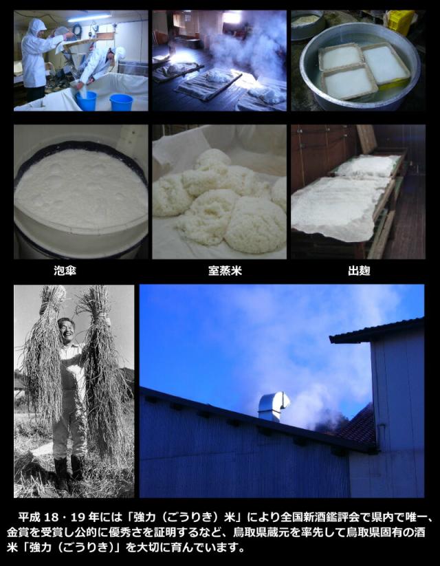 平成18・19年には「強力(ごうりき)米」により全国新酒鑑評会で県内で唯一、金賞を受賞し公的に優秀さを証明するなど、鳥取県蔵元を率先して鳥取県固有の酒米「強力(ごうりき)」を大切に育んでいます。
