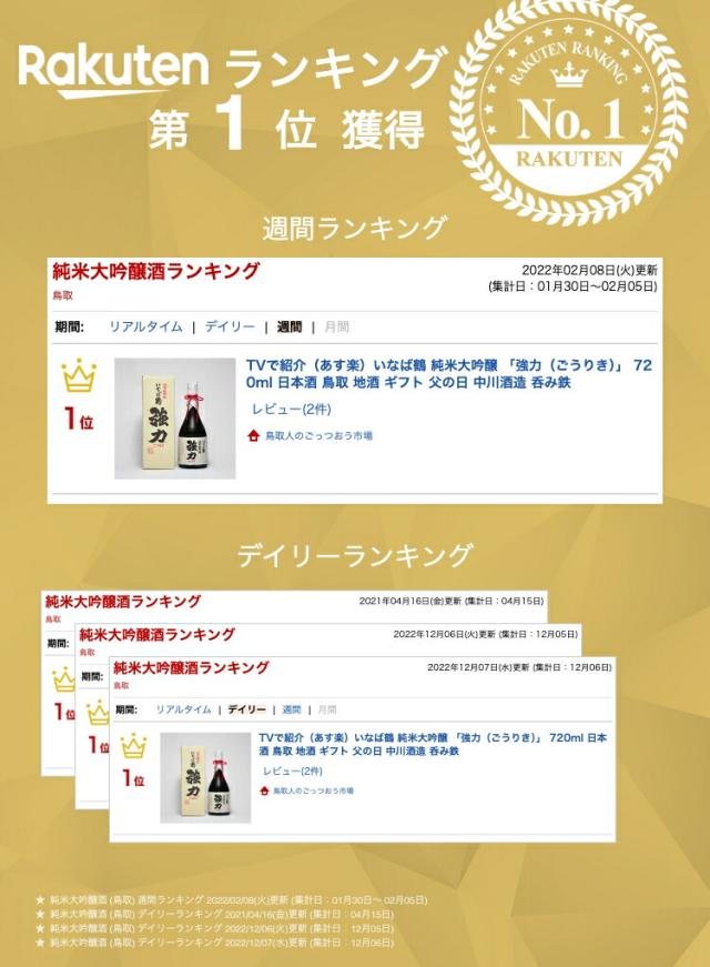 【包装無料】いなば鶴 純米大吟醸 「強力(ごうりき)」 720ml 日本酒 鳥取 地酒 ギフト 父の日 中川酒造 呑み鉄 TVで紹介