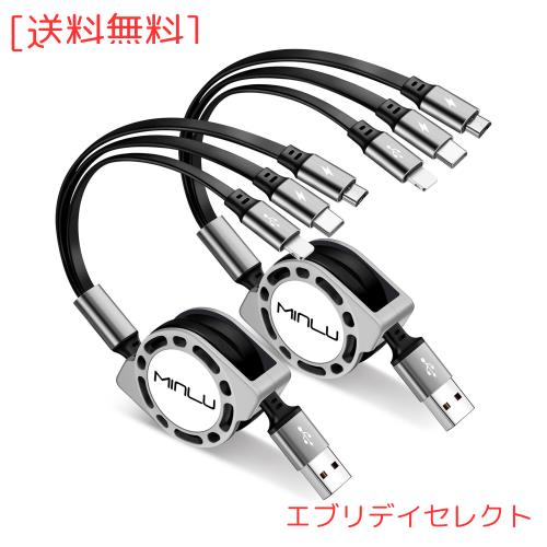 MINLU 充電コード 3in1 3.0A 2セット 格納式充電コード マルチUSBケーブル 高速充電器コードアダプター ライトニング/タイプC/Micro USB