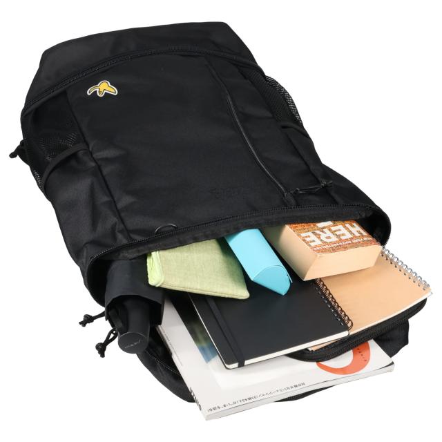 部活や仕事の大荷物も収まる大容量BOXリュックブランドロゴの刺繍、ブランドアイコンのエンジェルワッペンが印象的なBOX型のリュックサック。最大B4ファイルまで対応可能なサイズ感で、通学からカジュアルスタイルまでお使いいただけます。メインルームの内側には、15インチ程度のPCを収納可能なクッションポケットを完備。下部のサブルームには、着替えやシューズなどメインルームと仕分けたい荷物がある際に便利な収納スペース。(※サブルームを使用した際はメインルームはA4サイズまで収納可能、使用してない場合はB4サイズまで対応可能。)ポケット機能も充実しており、フロントには使い勝手の良い縦ファスナーポケットを設計し、サイドポケットは、通気性の良いメッシュ素材を使用。上部にもスマートフォンなどの収納に役立つファスナーポケットが備わっています。さらに背面にはメインルームへ直接アクセス可能なファスナーポケットも。熱がこもりやすい背面には、メッシュ素材を採用し蒸れにくい仕様に。