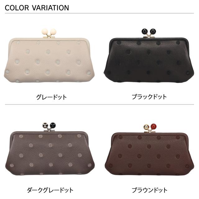がま口部分のアクリル玉がかわいい長財布。本体は山羊革を使用しふんわりした手触りがポイントです。がま口を開ければ中を一度で見渡せるのが使いやすいポイントです。